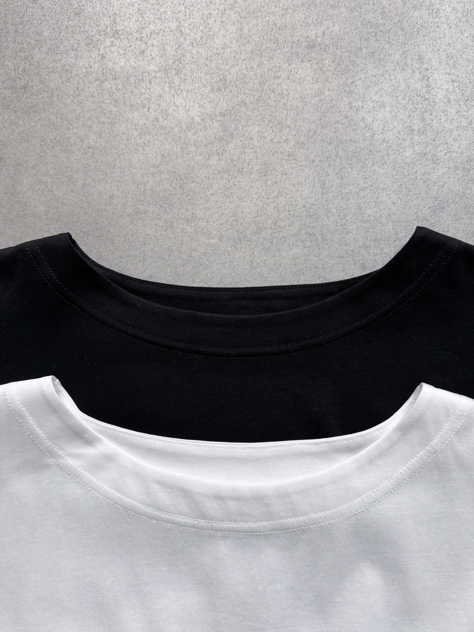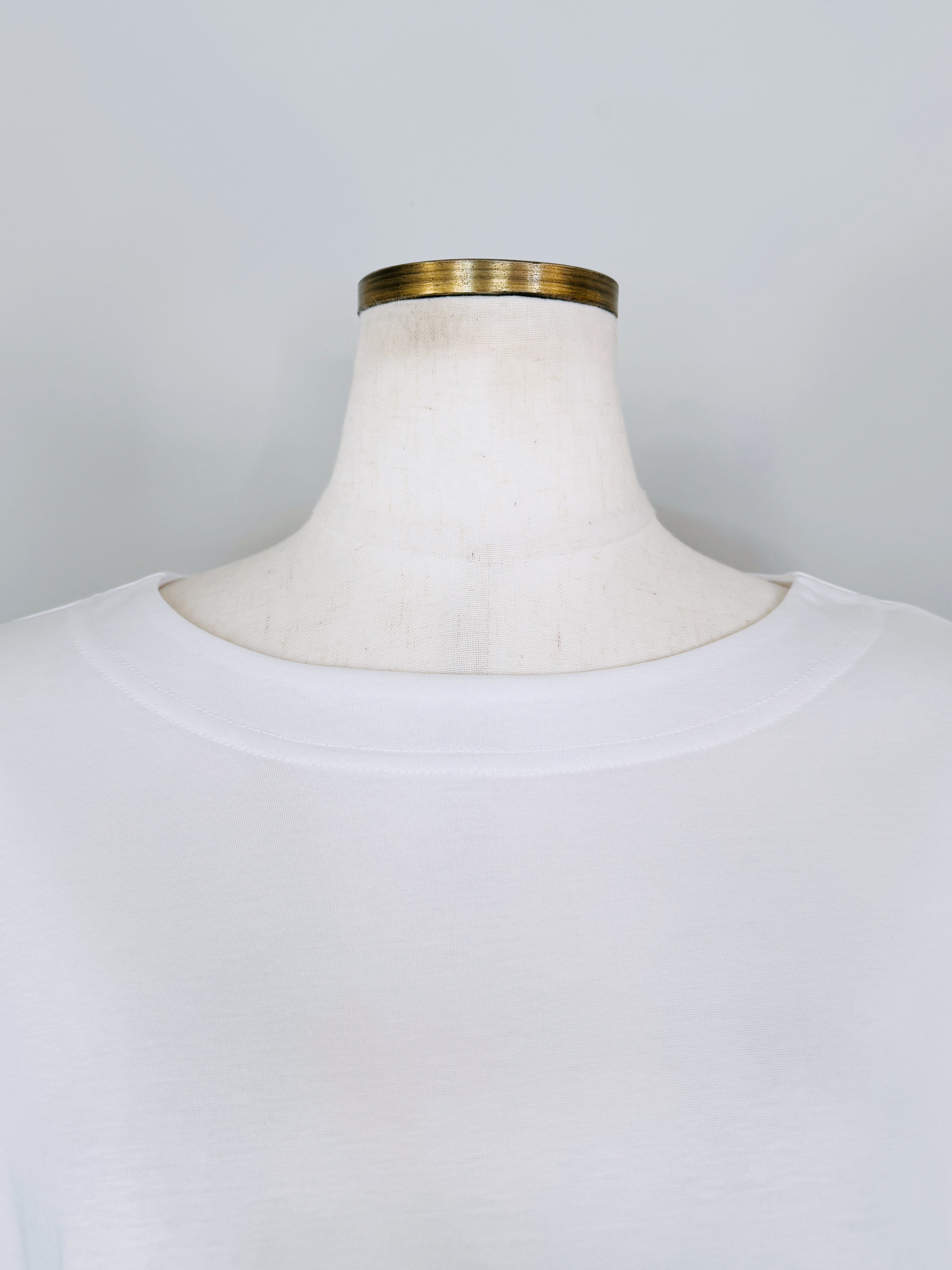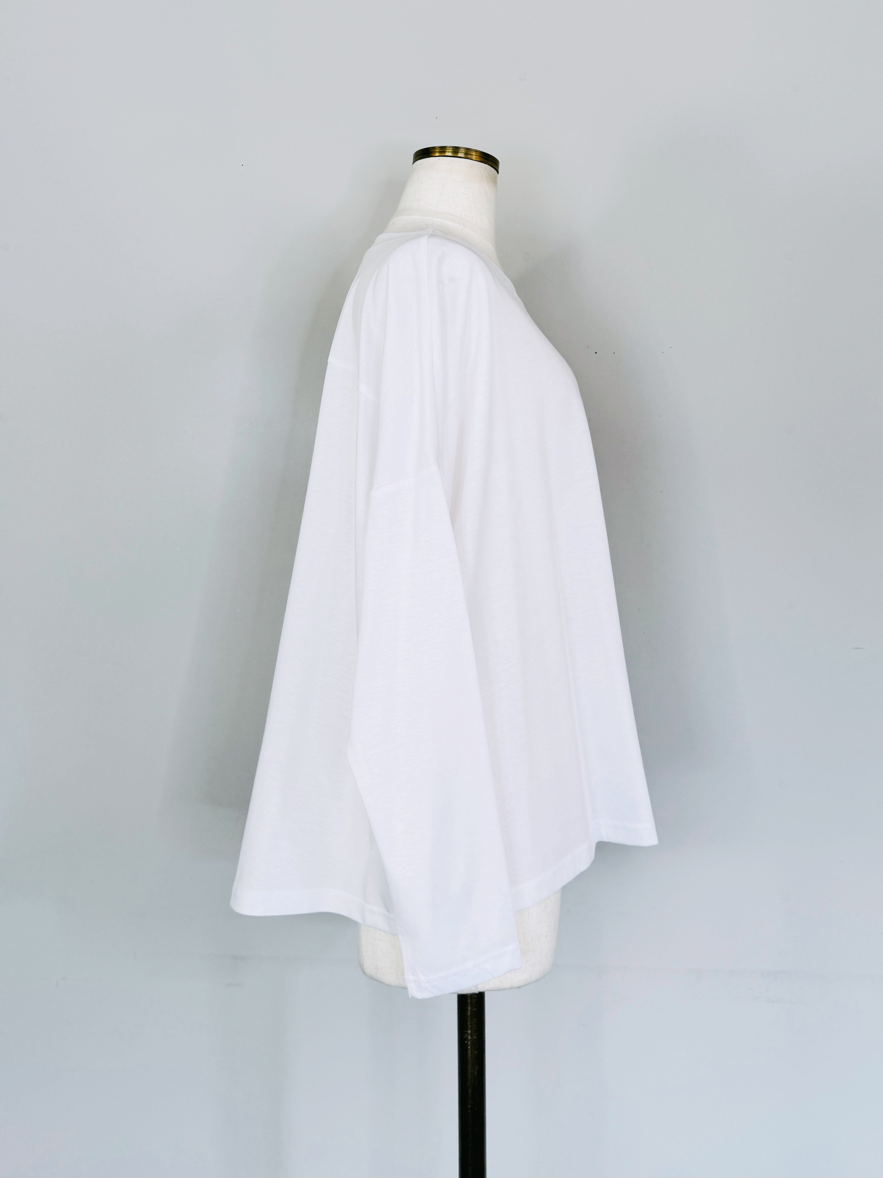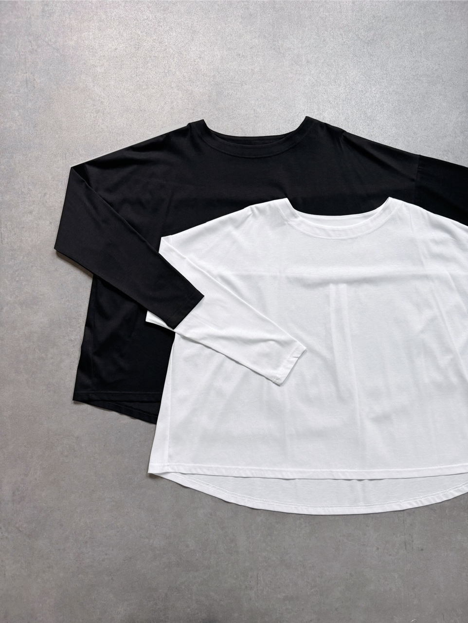 ラウンドネックとシンプルな無地で、リラックス感がありながらもきちんと見えを叶えます。