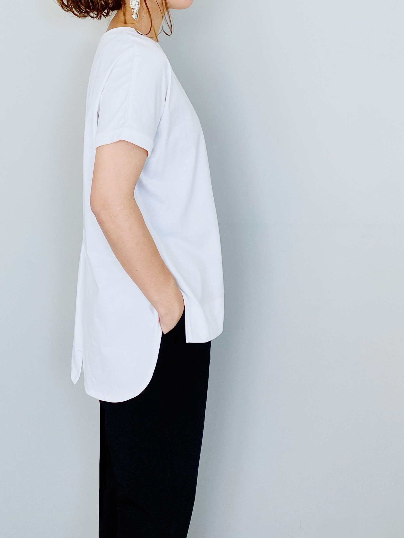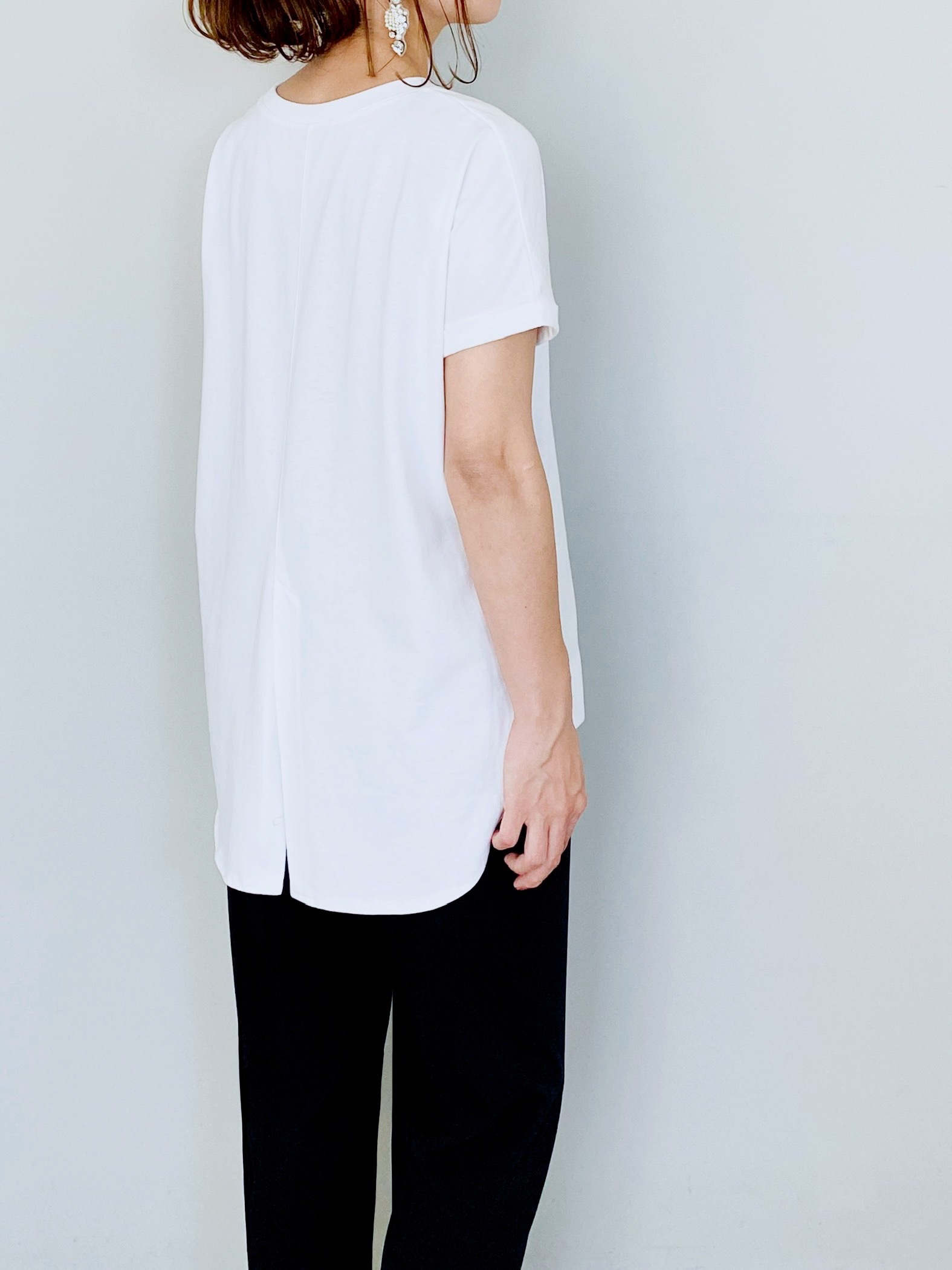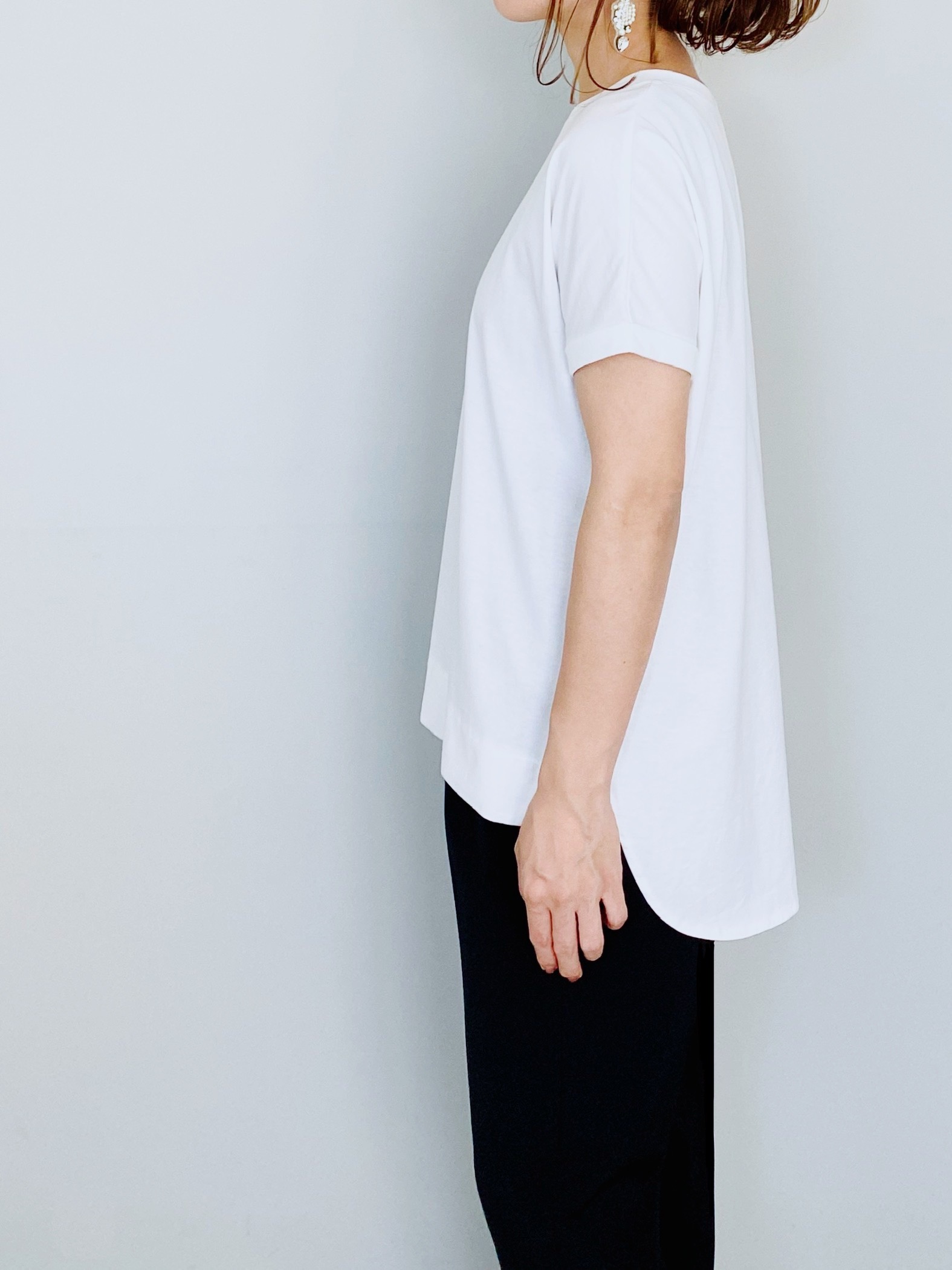 前後で異なる裾や、後ろベンツ開きなど、さりげない細部のデザインが施されたTシャツです。