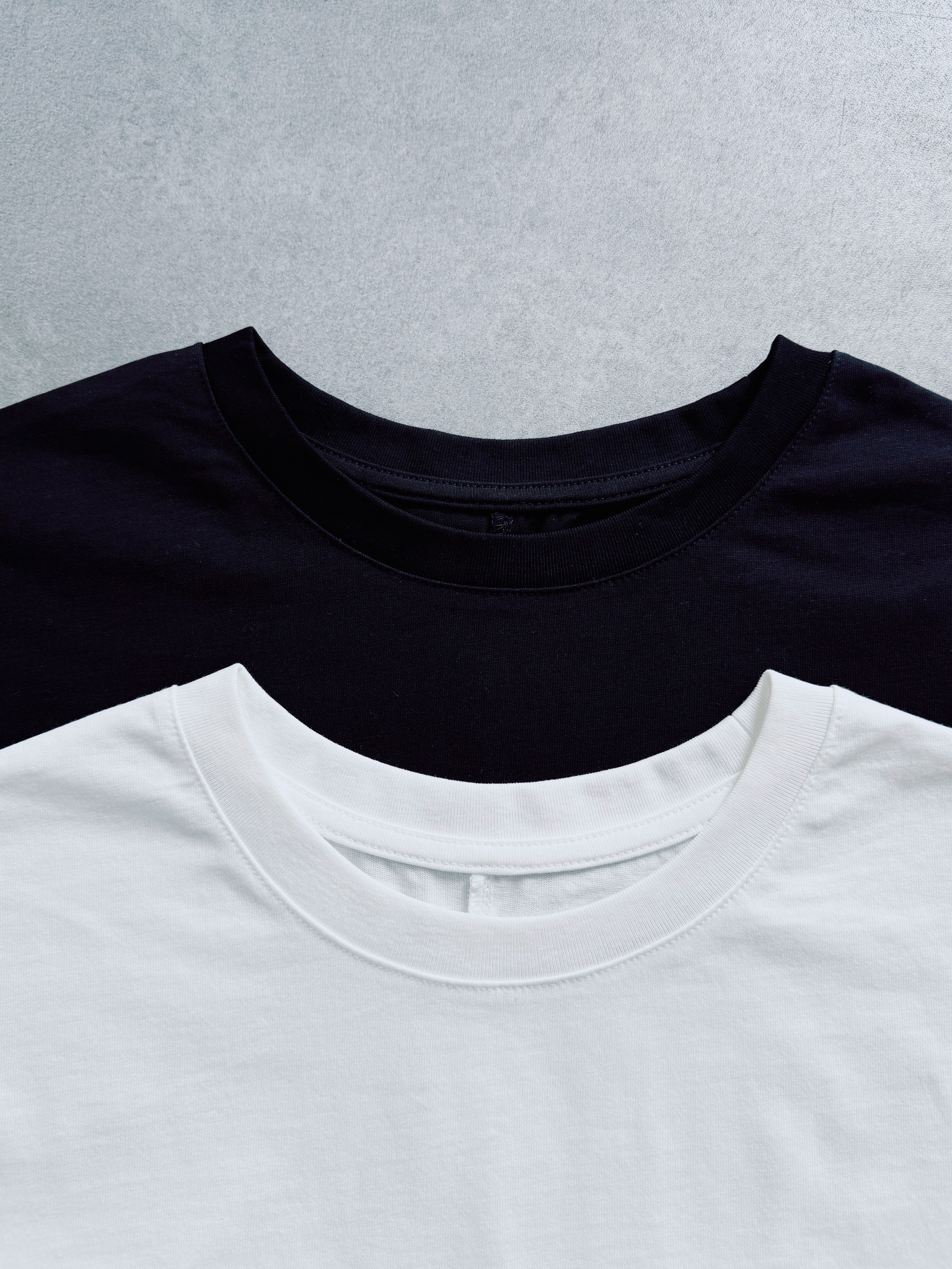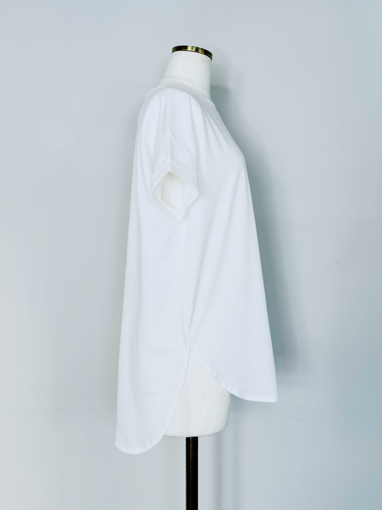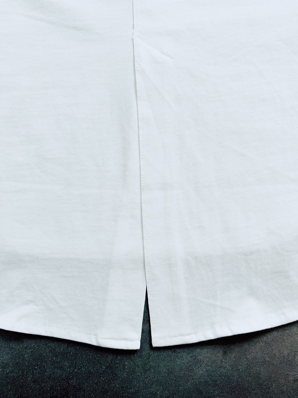 前後で異なる裾や、後ろベンツ開きなど、さりげない細部のデザインが施されたTシャツです。