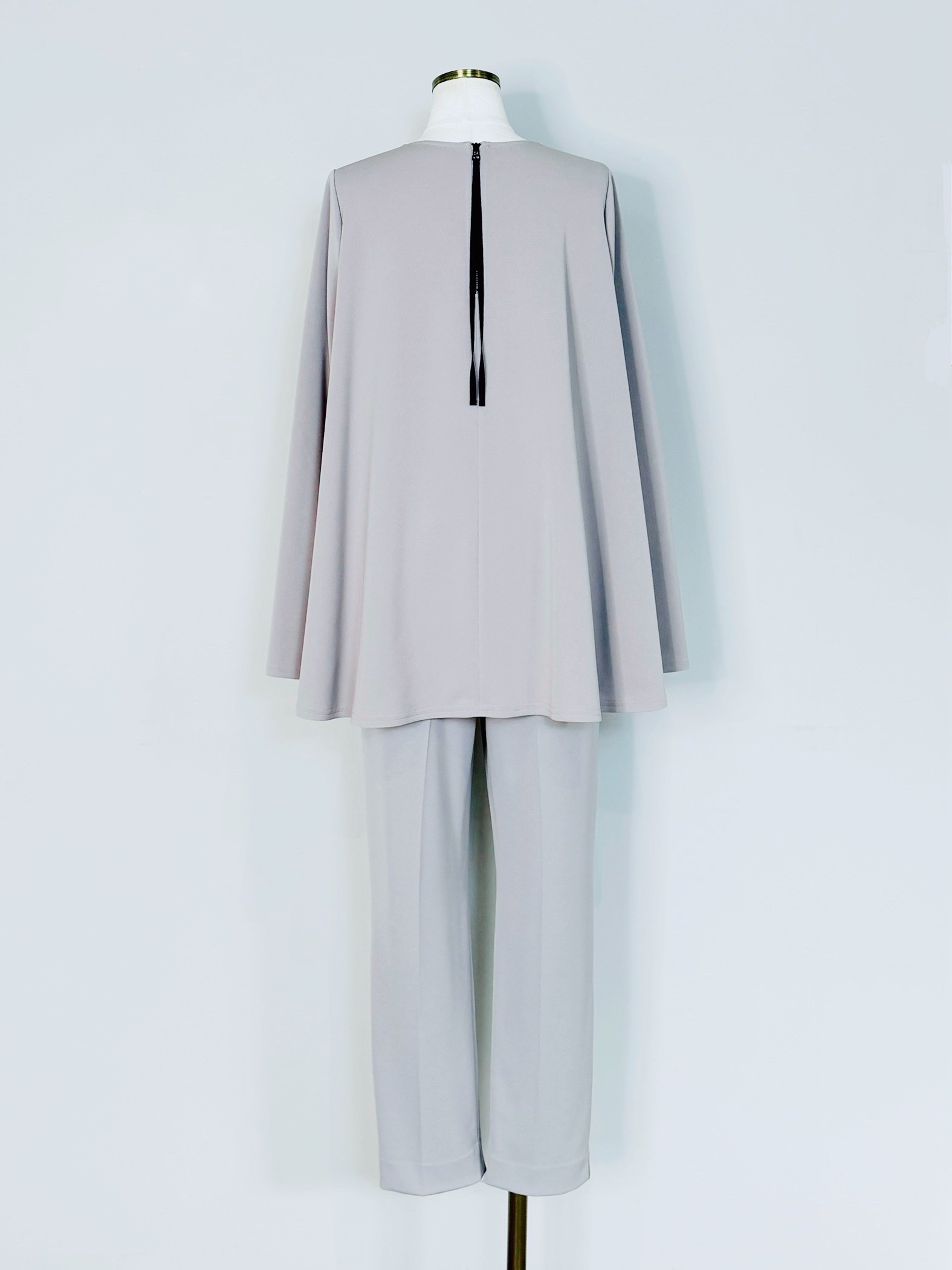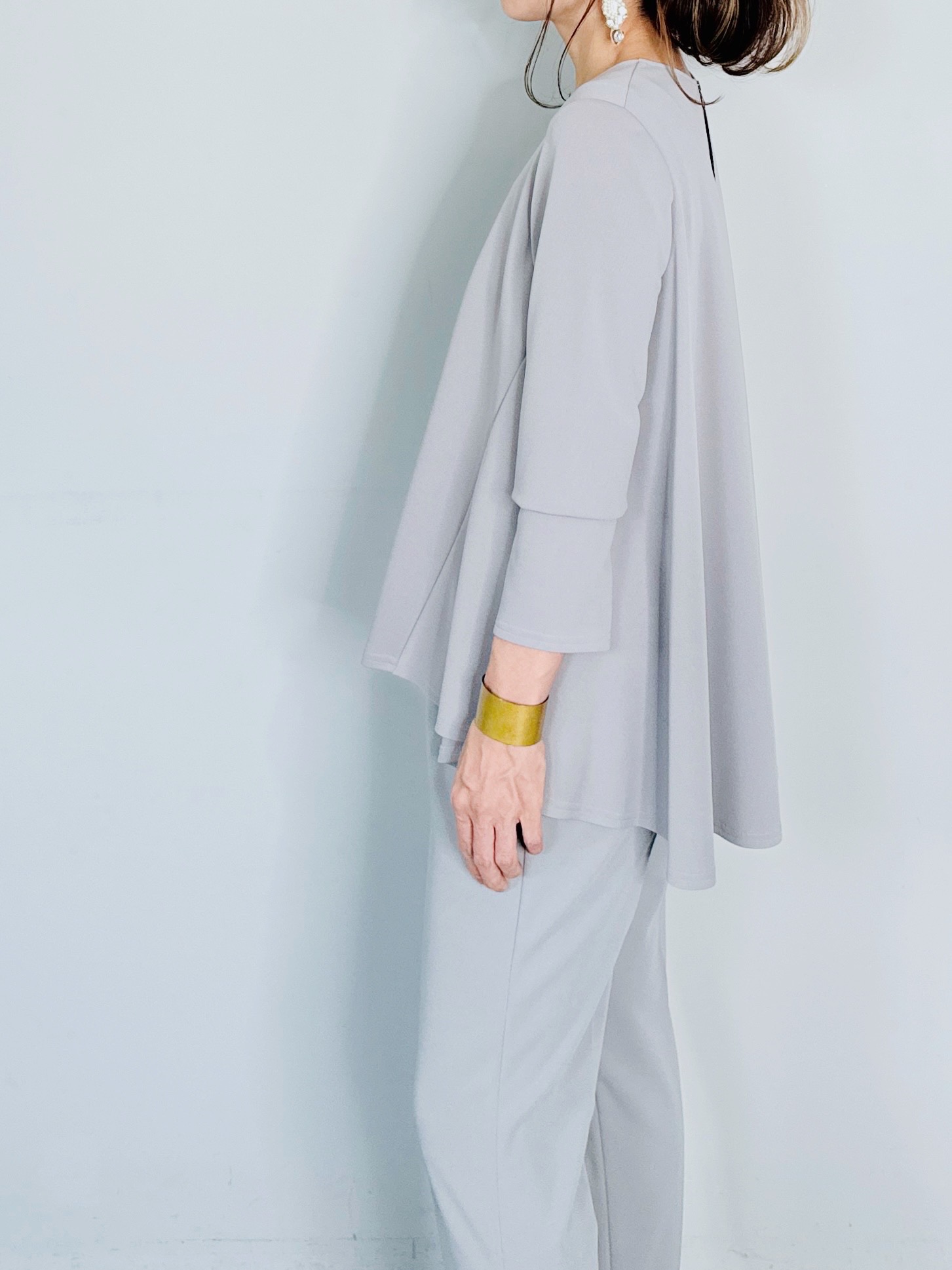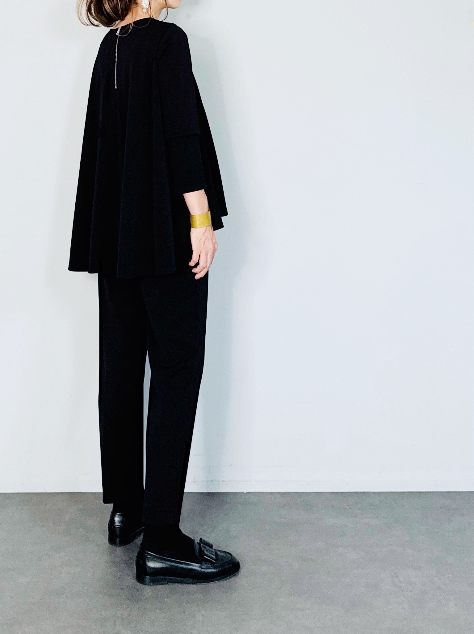 バックのセンタージップとフレアーラインが印象的なポンチブラウス。