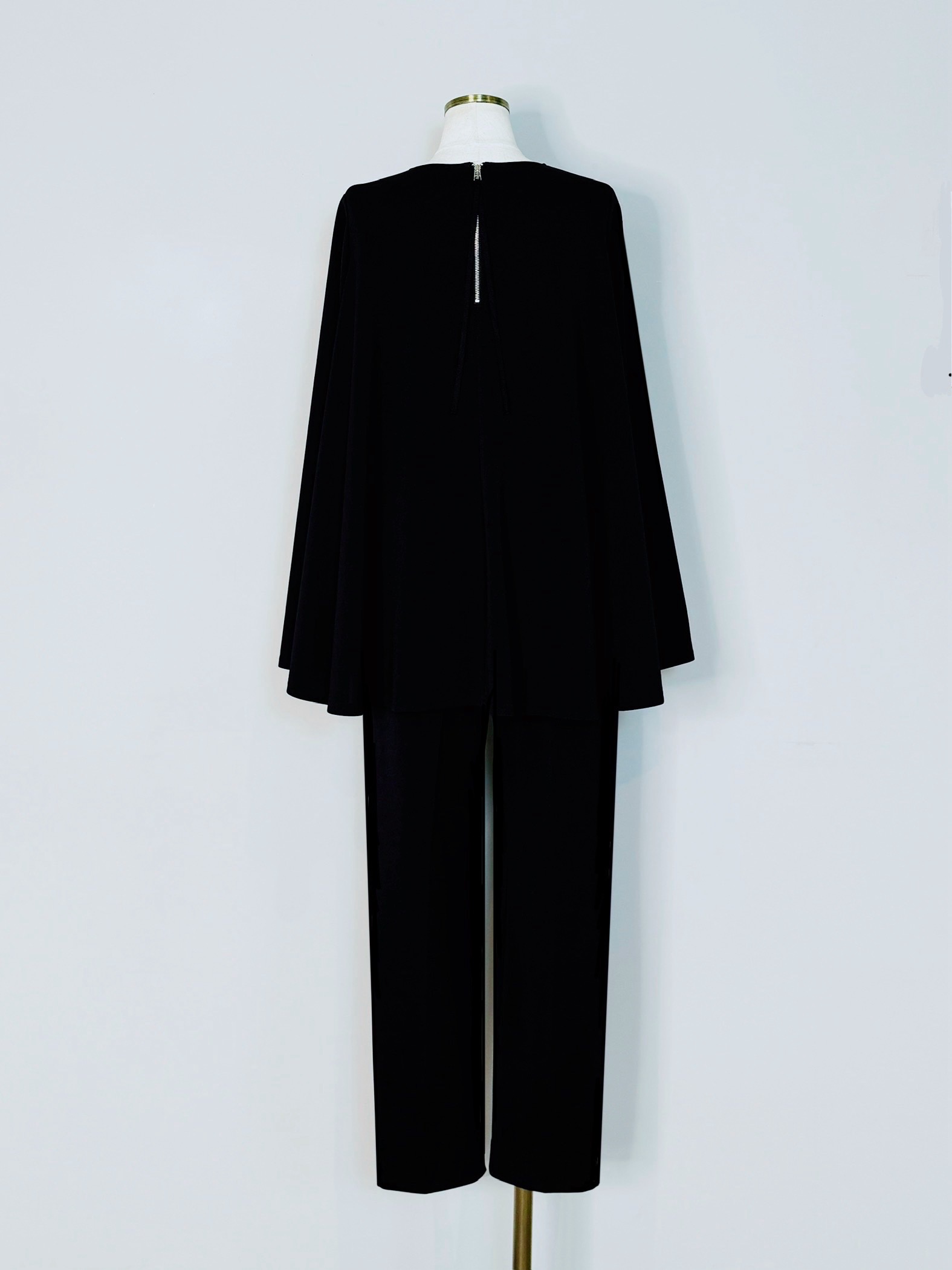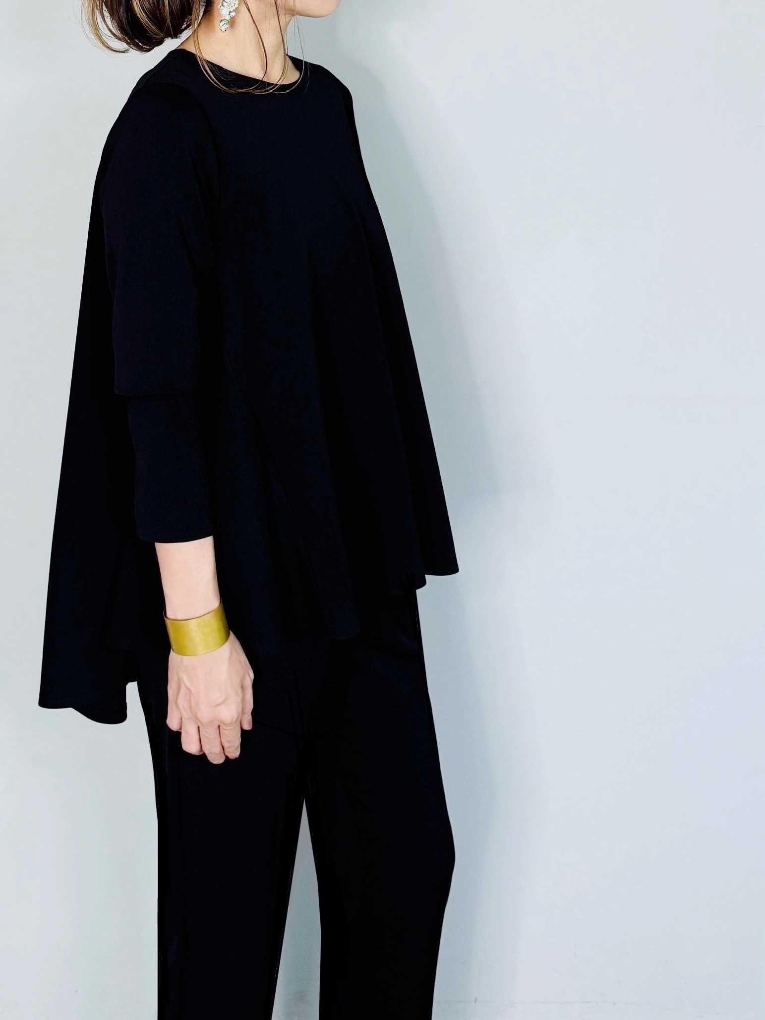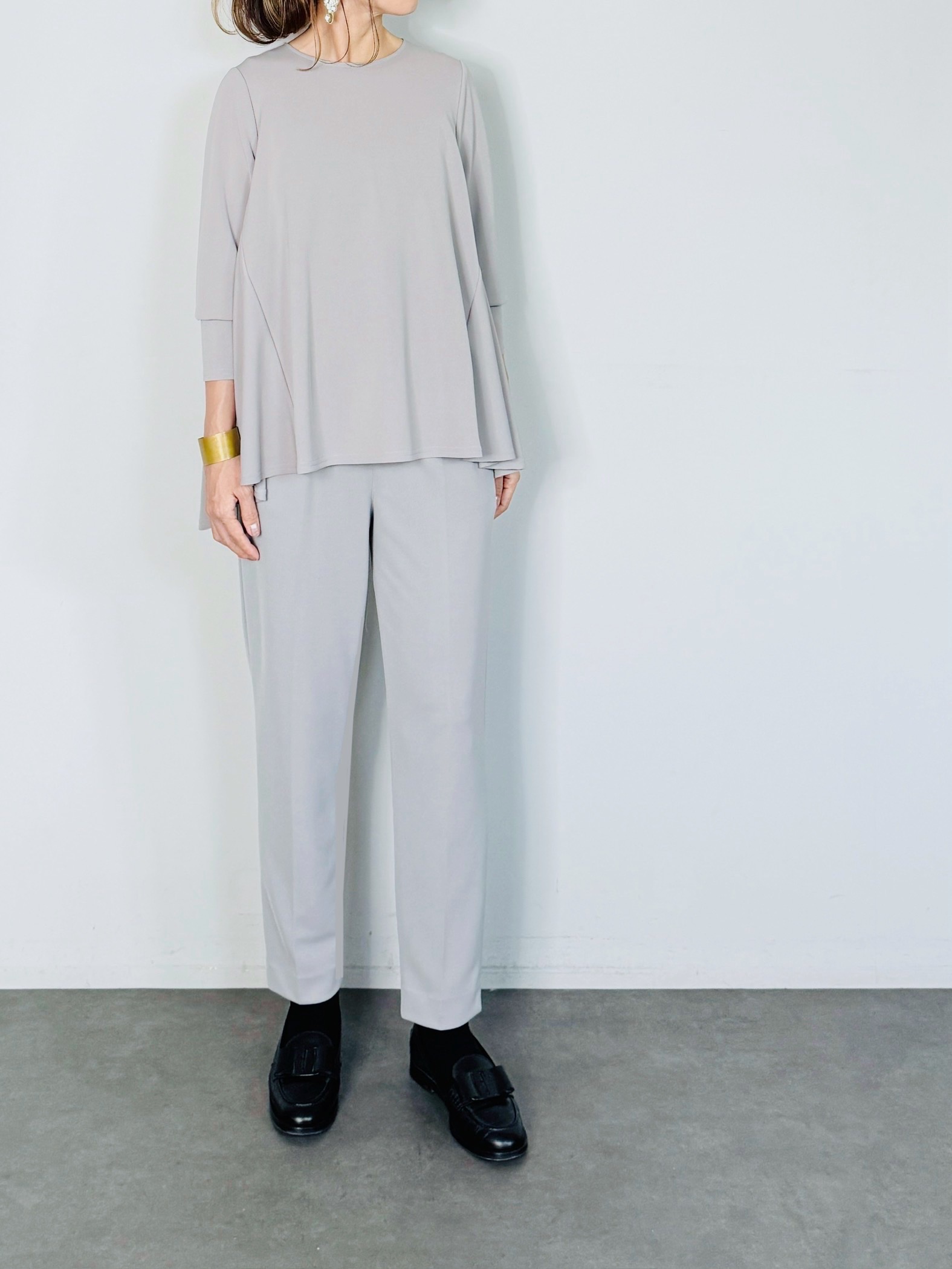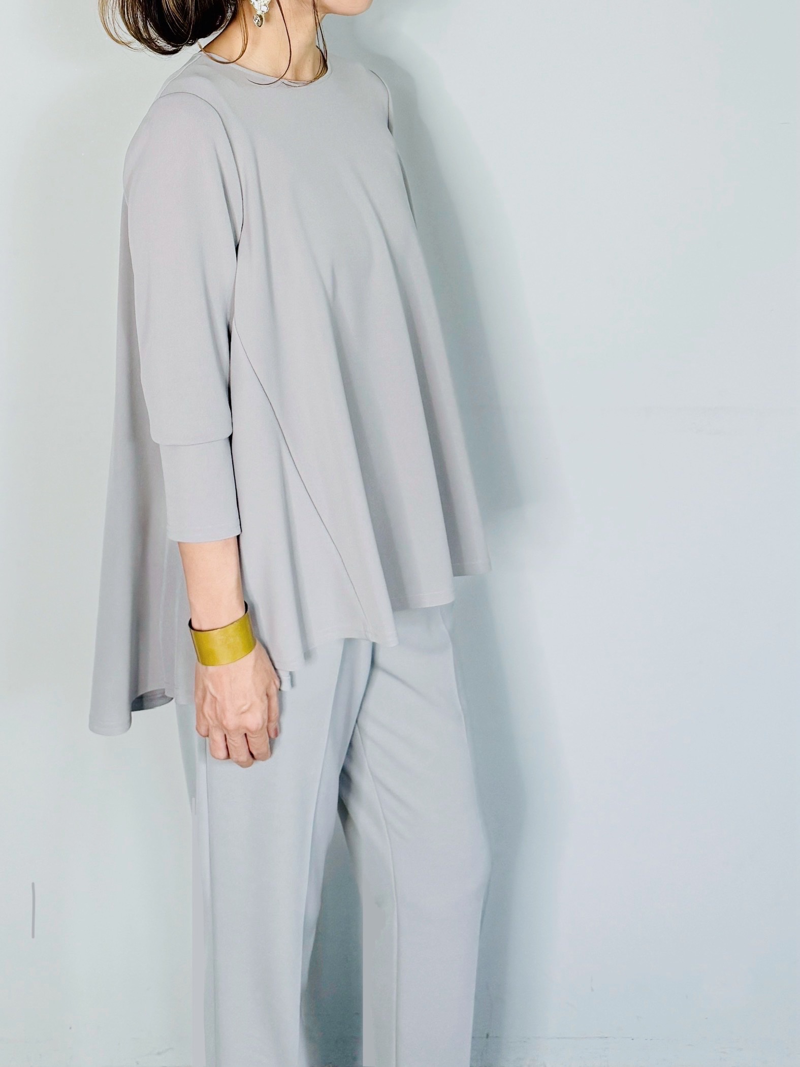 バックのセンタージップとフレアーラインが印象的なポンチブラウス。