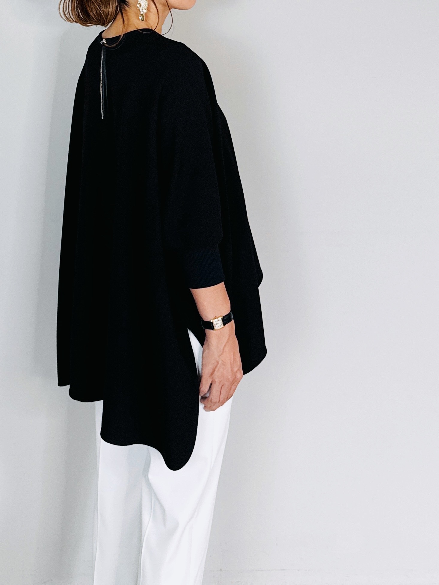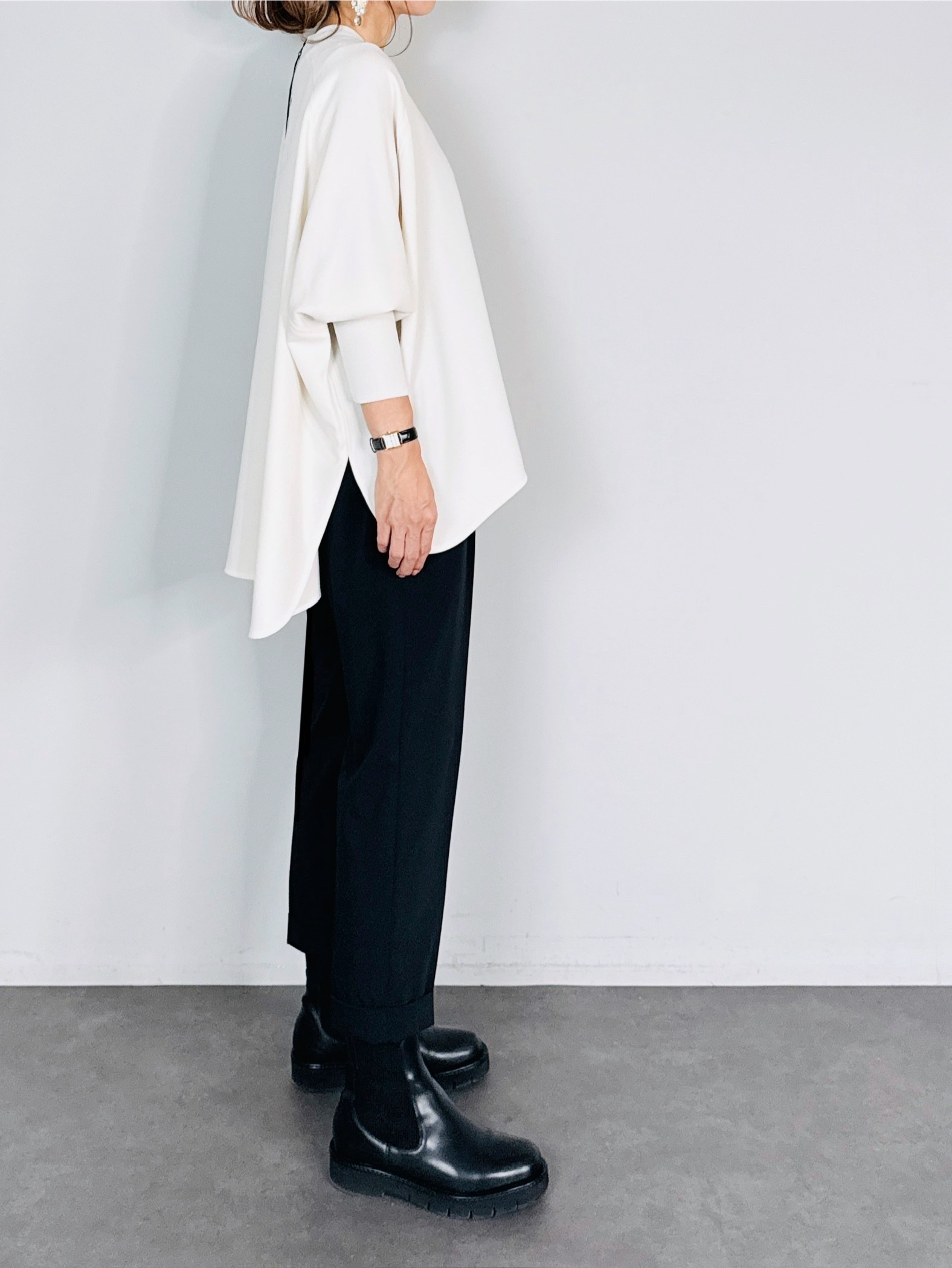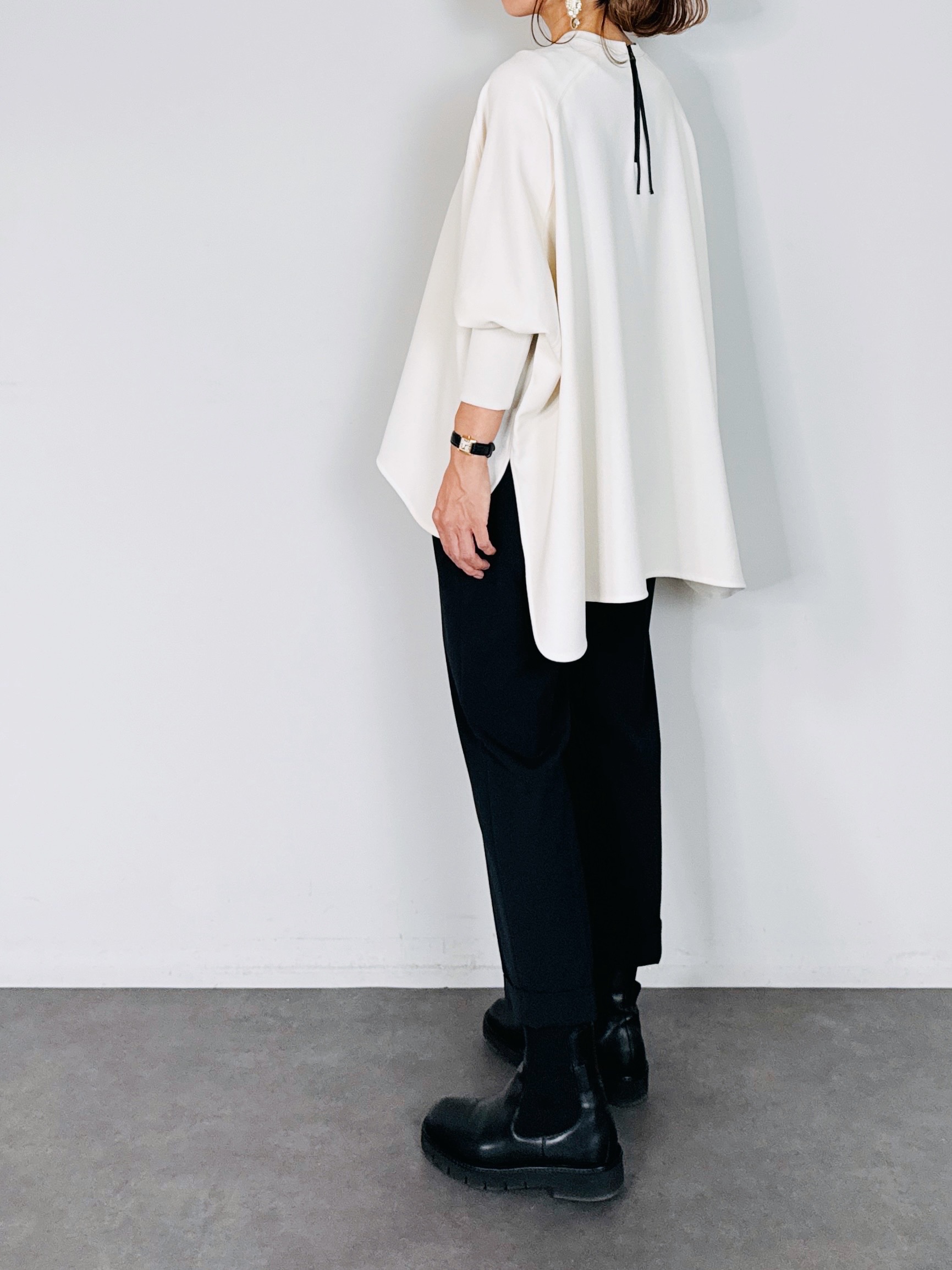 バックジップがアクセントになり、シルエットもオーバーにすることでラフでメンズライクな印象に。