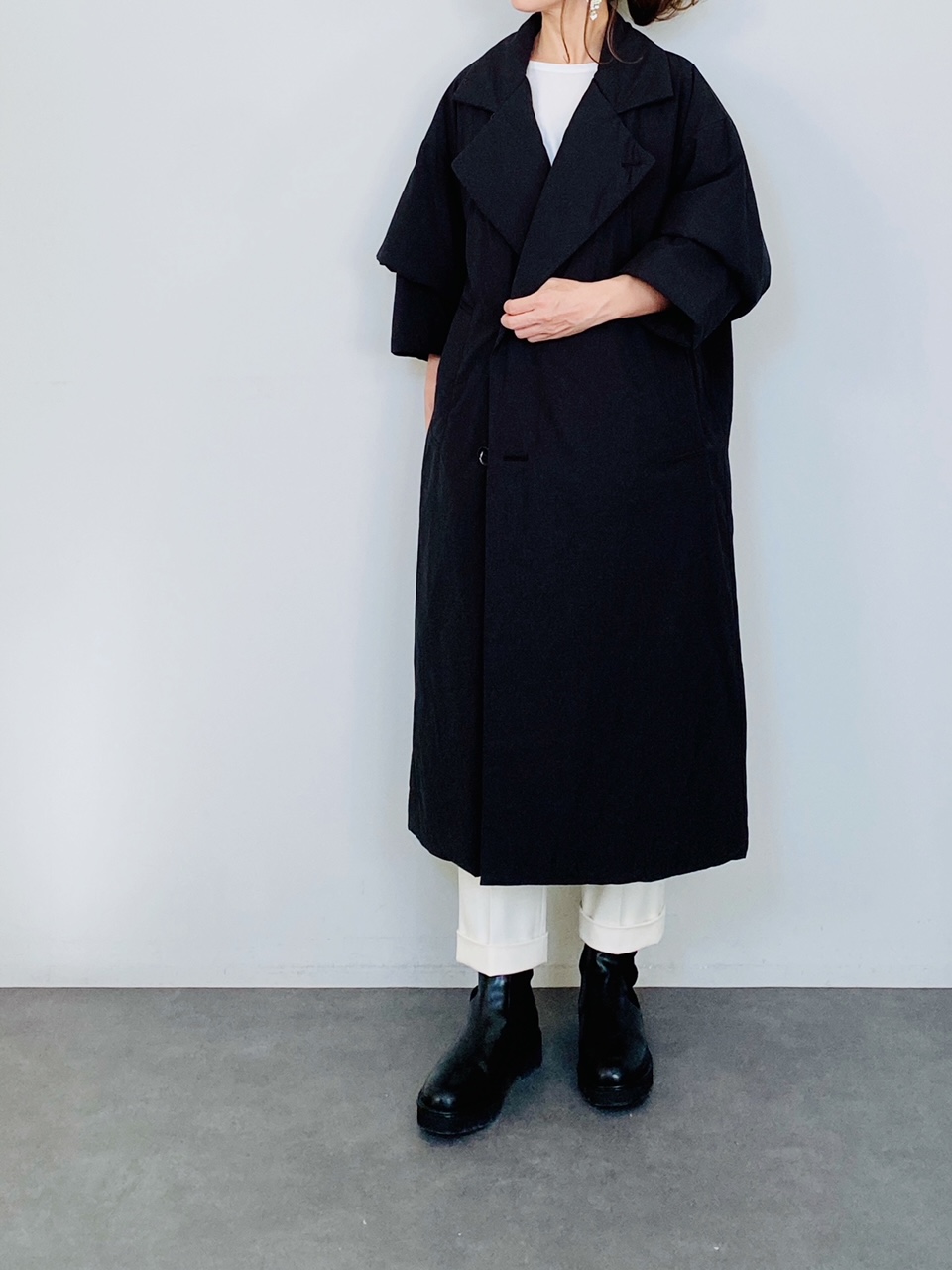 ボリュームのあるトップスの上にも着れるビッグシルエットが重宝するサイジング。