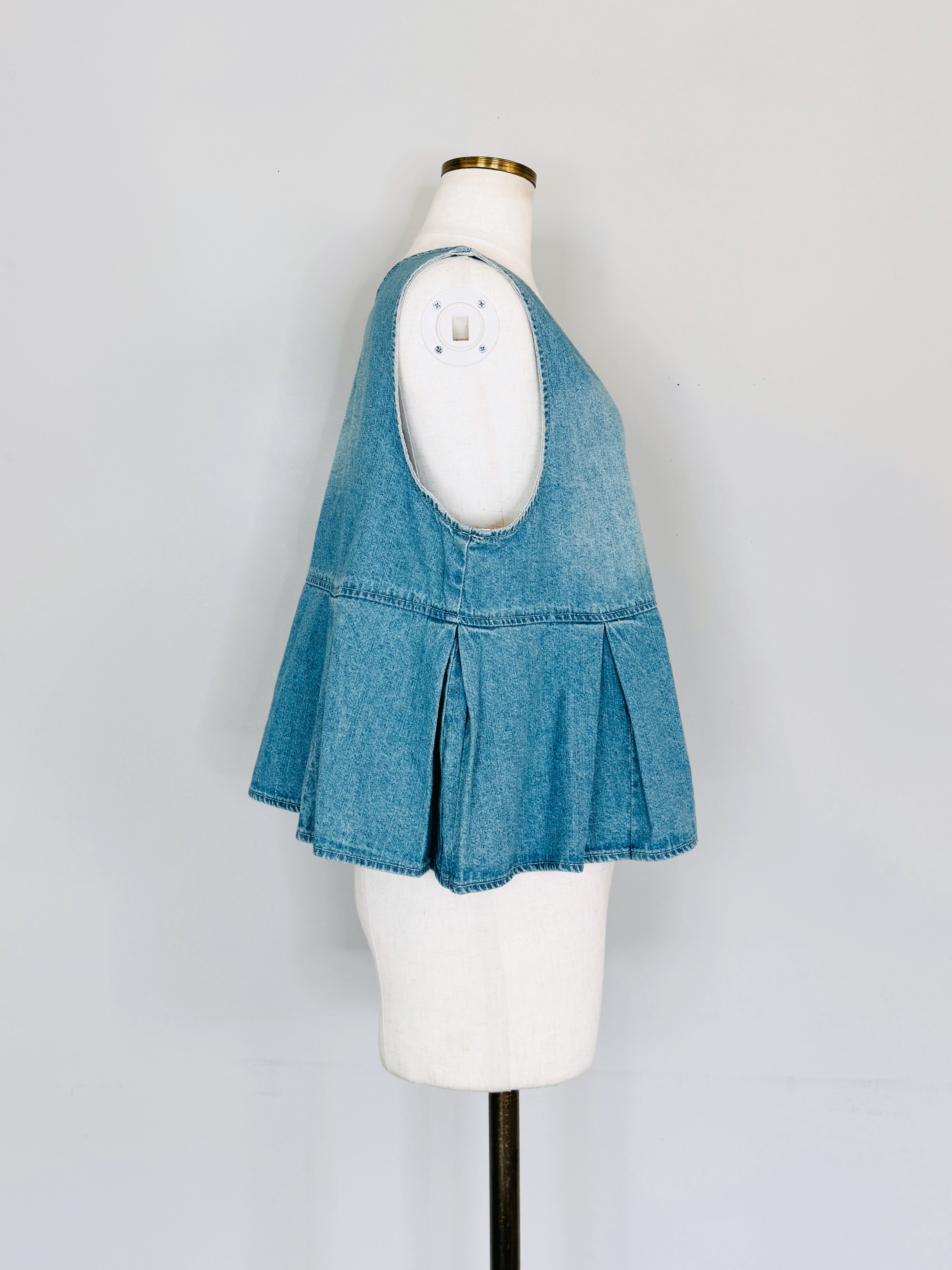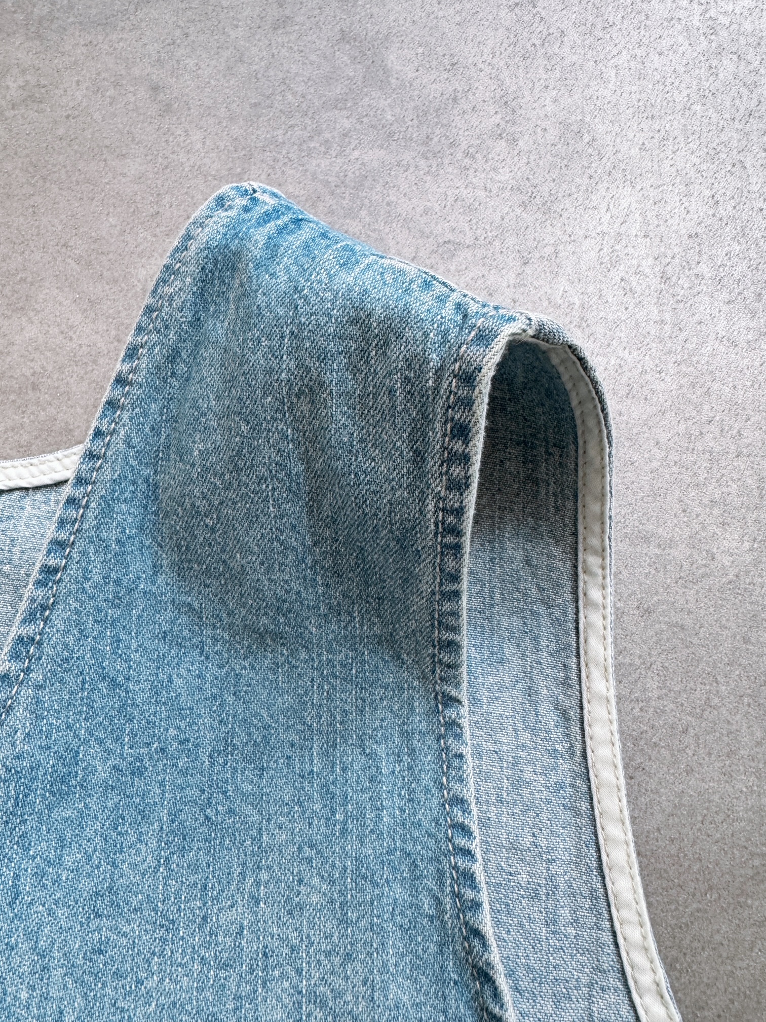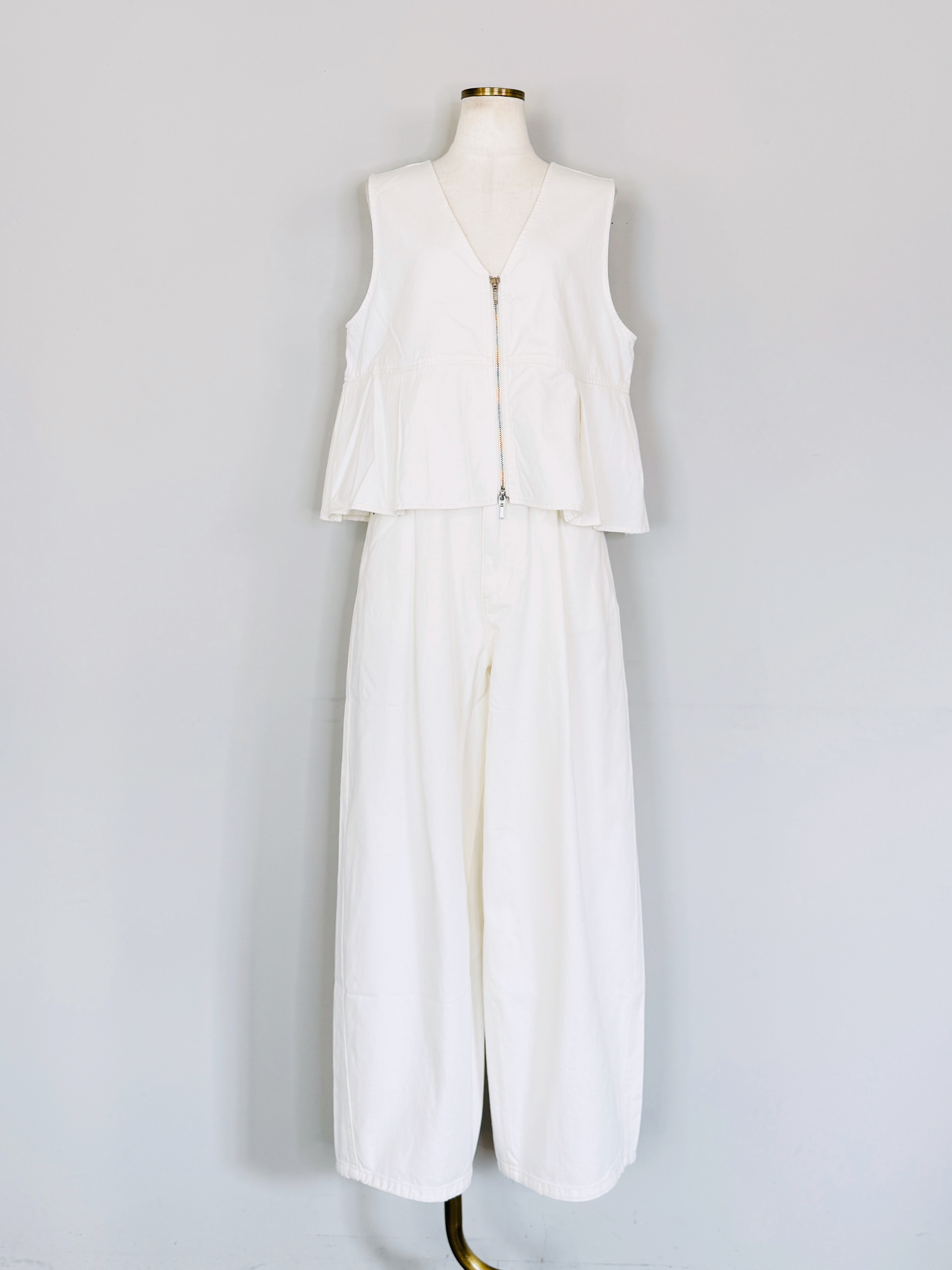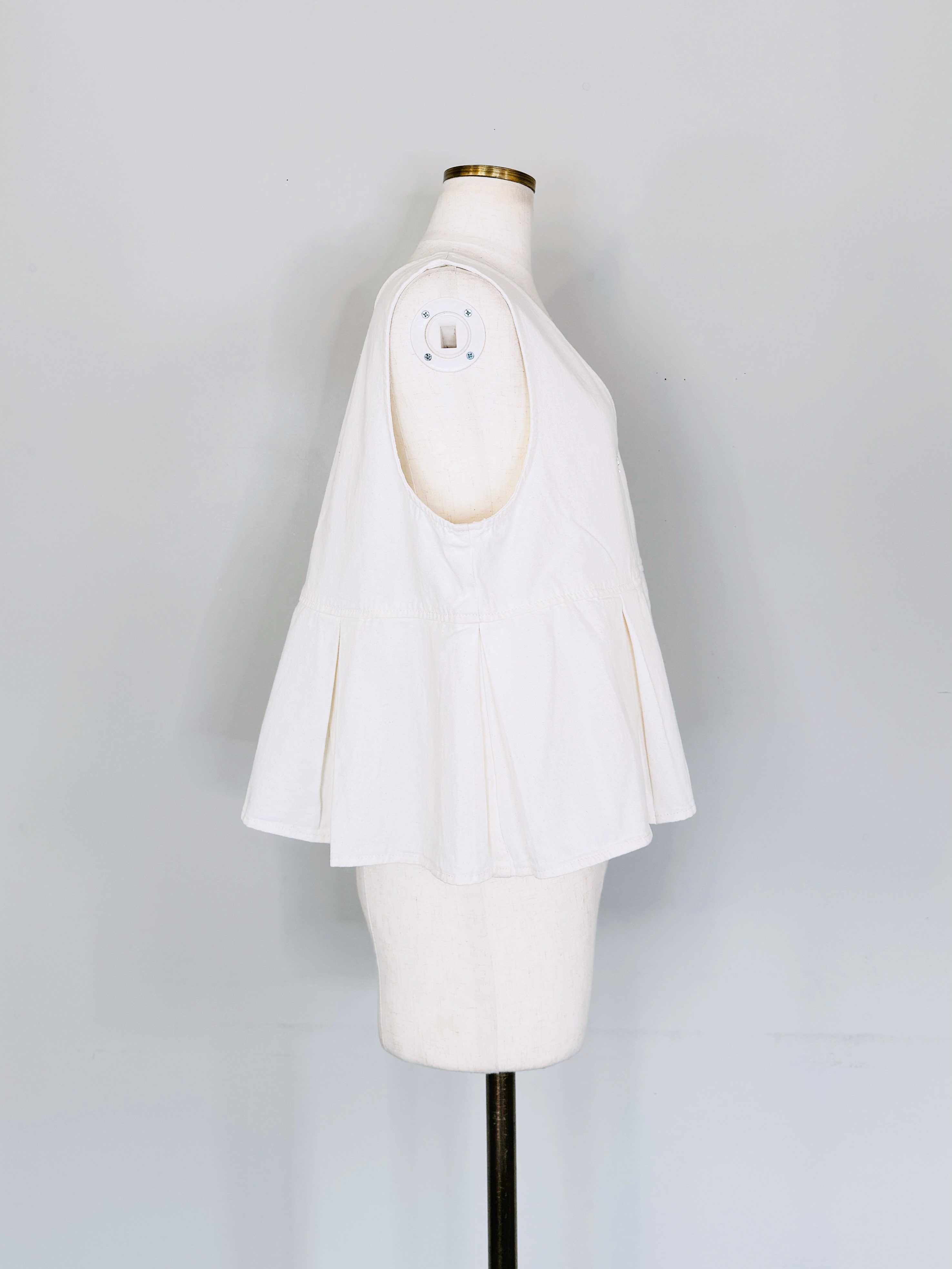 やわらかなデニムの風合いにペプラムのデザインを効かせたジレ。