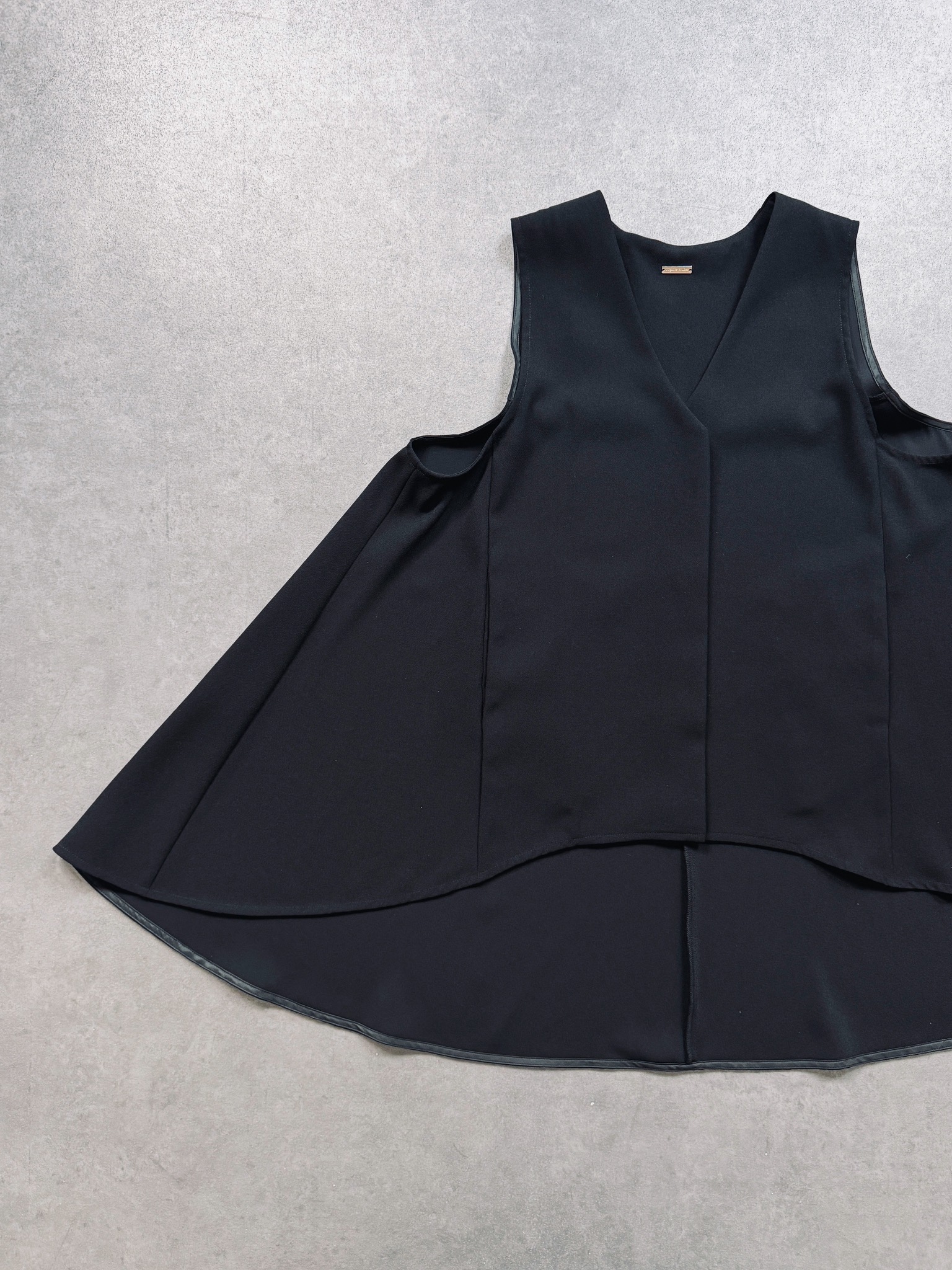 ショート丈のフロントとロング丈のバックの前後差ありの裾フレアトップスデザインがポイントのディープVネックベスト。