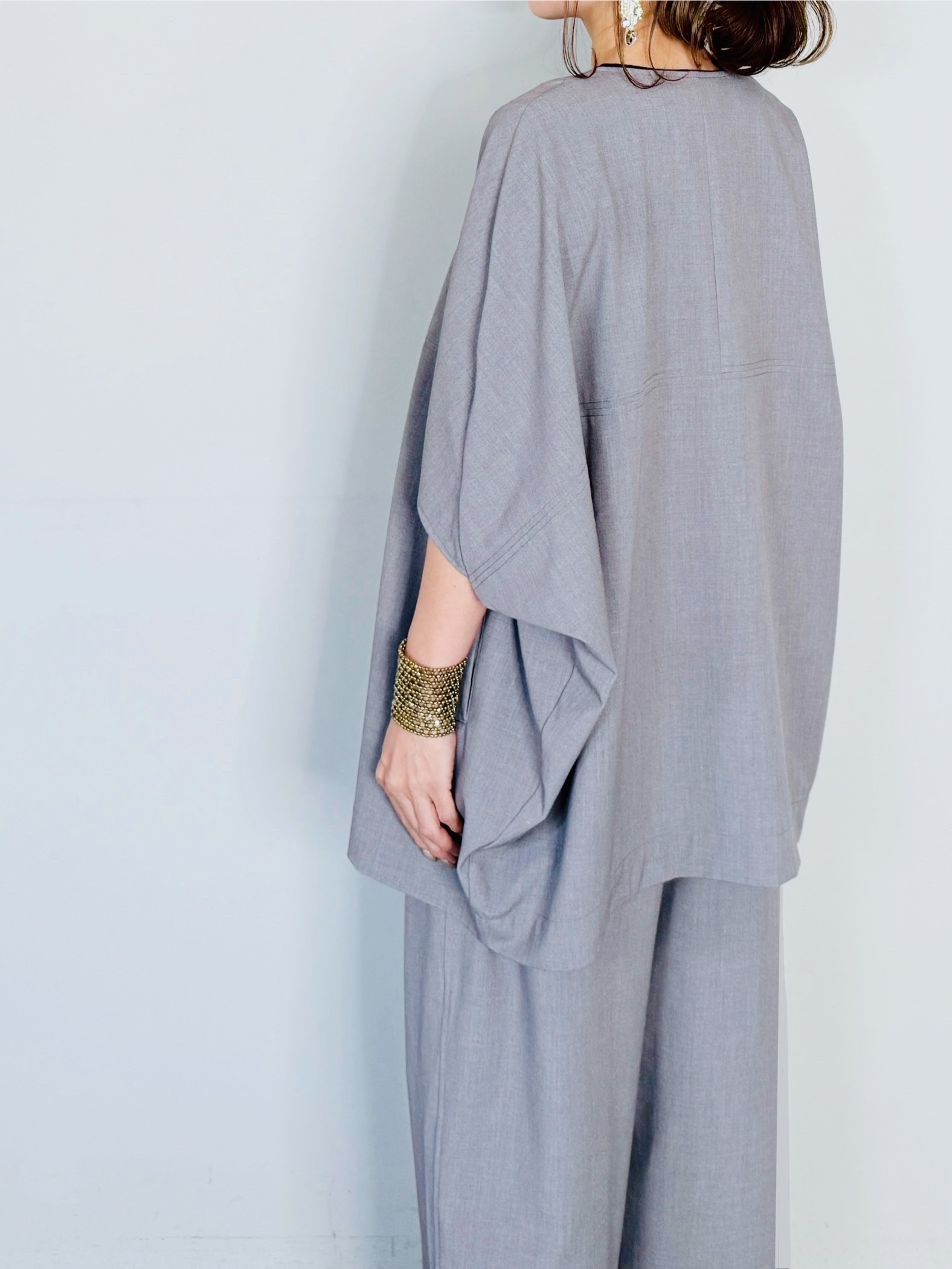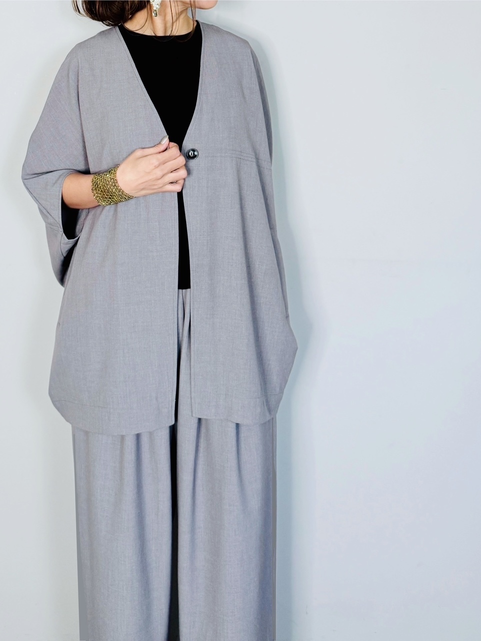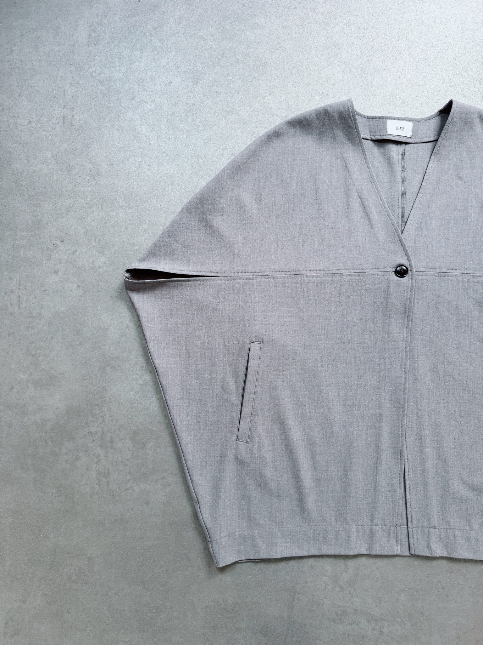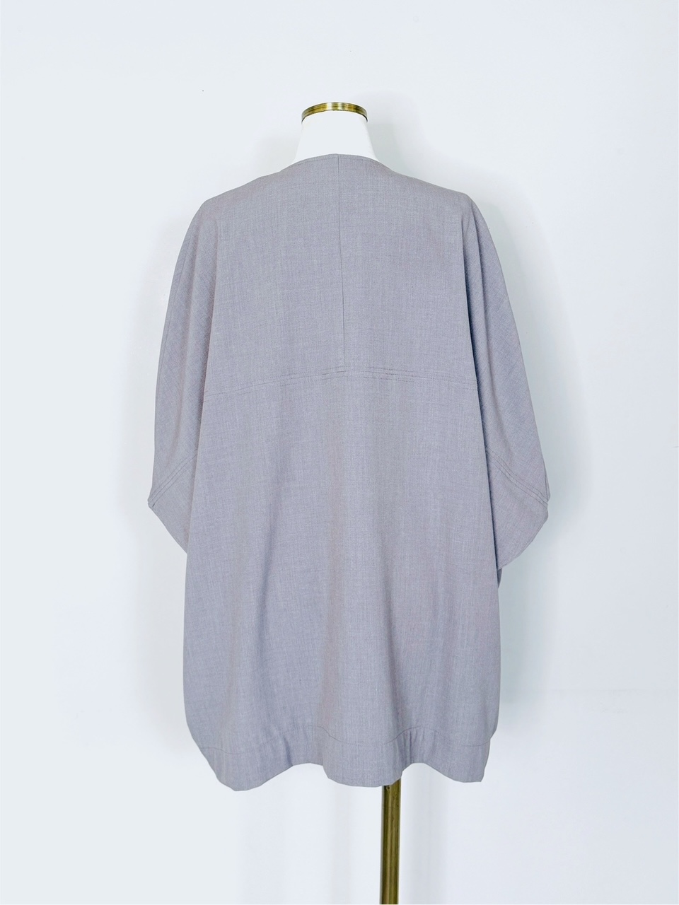 首元はすっきりと見えるVネック仕様で二の腕をカバーする5分袖のドルマンスリーブの形の羽織ベストです。