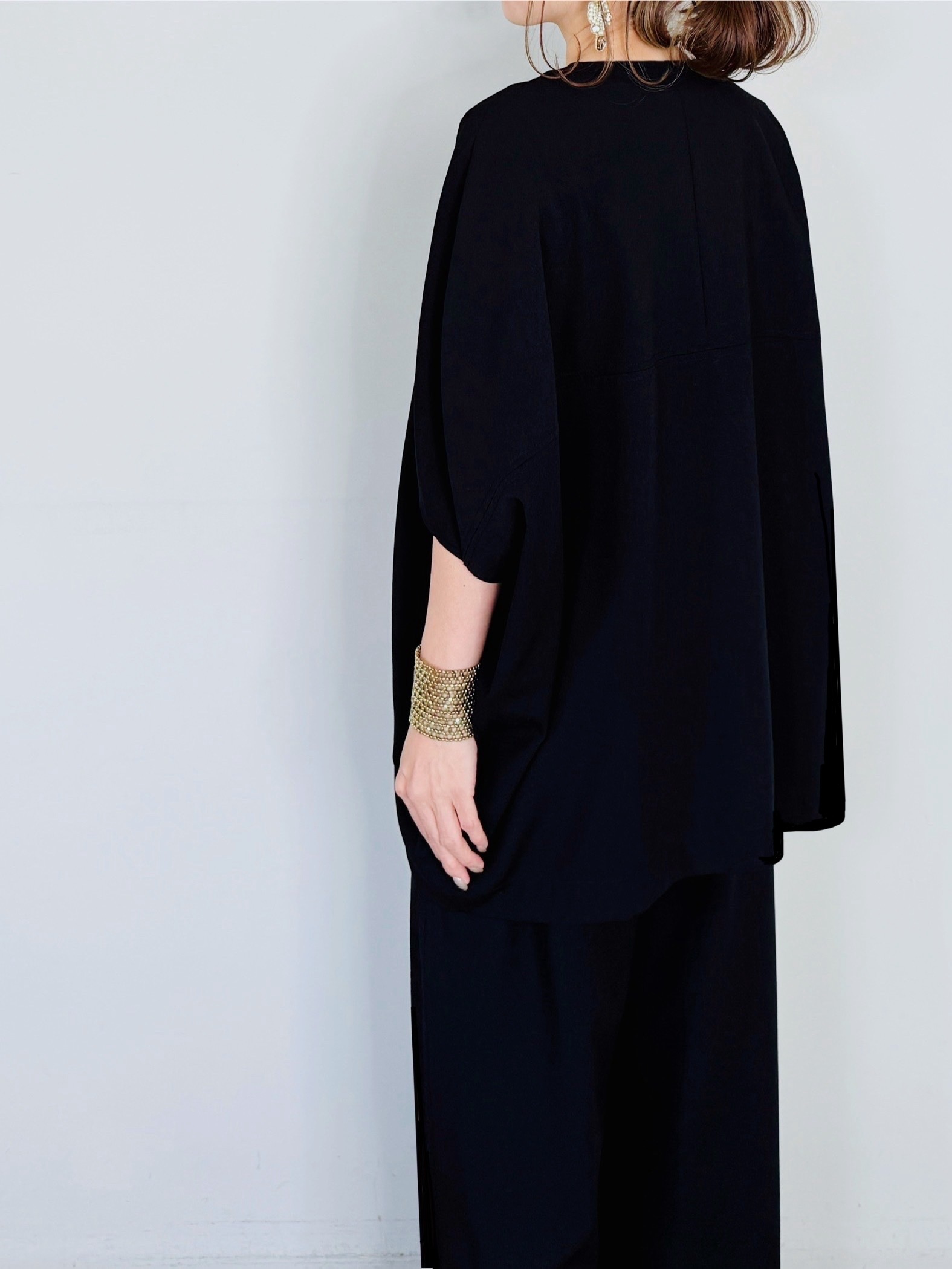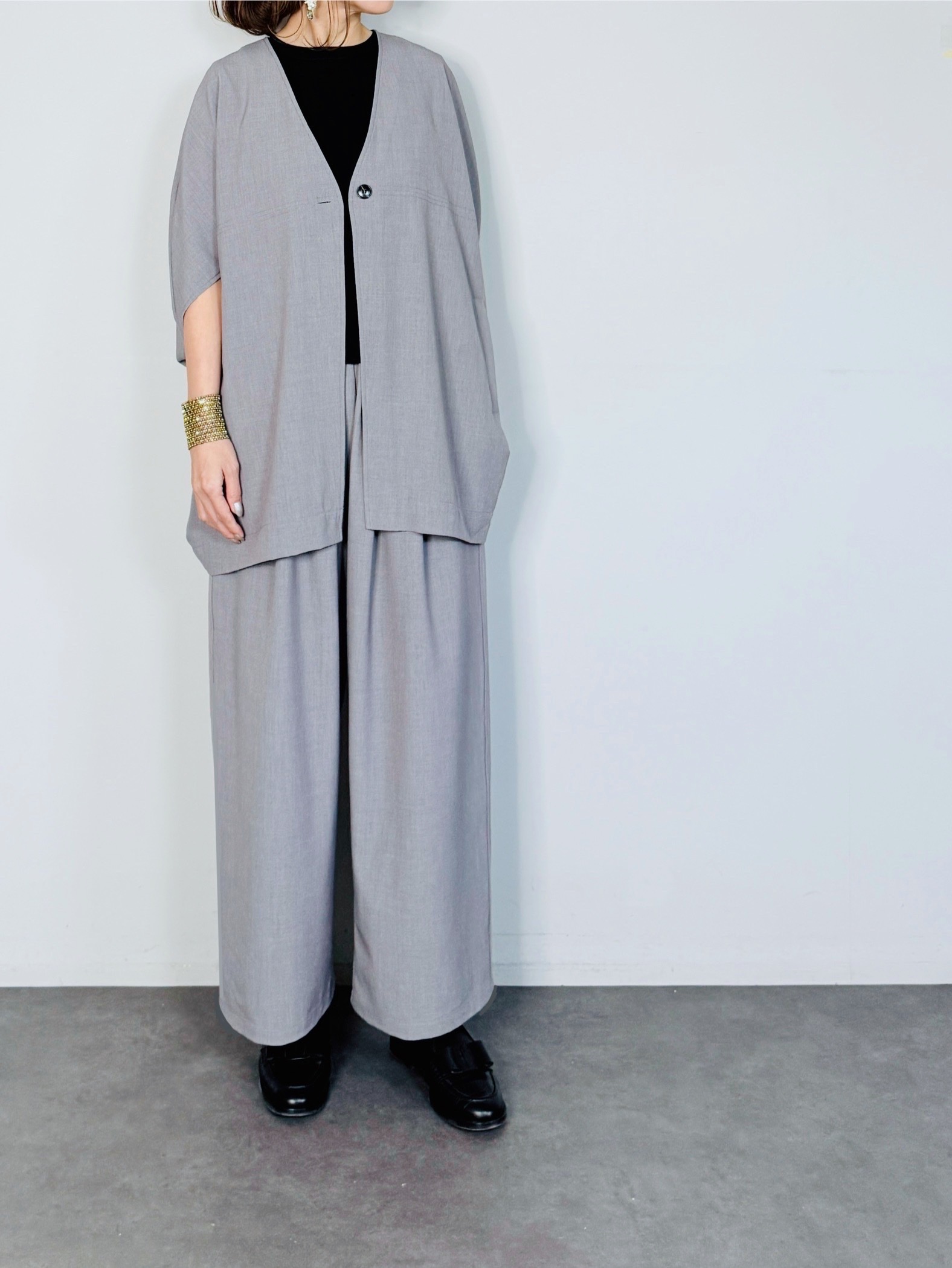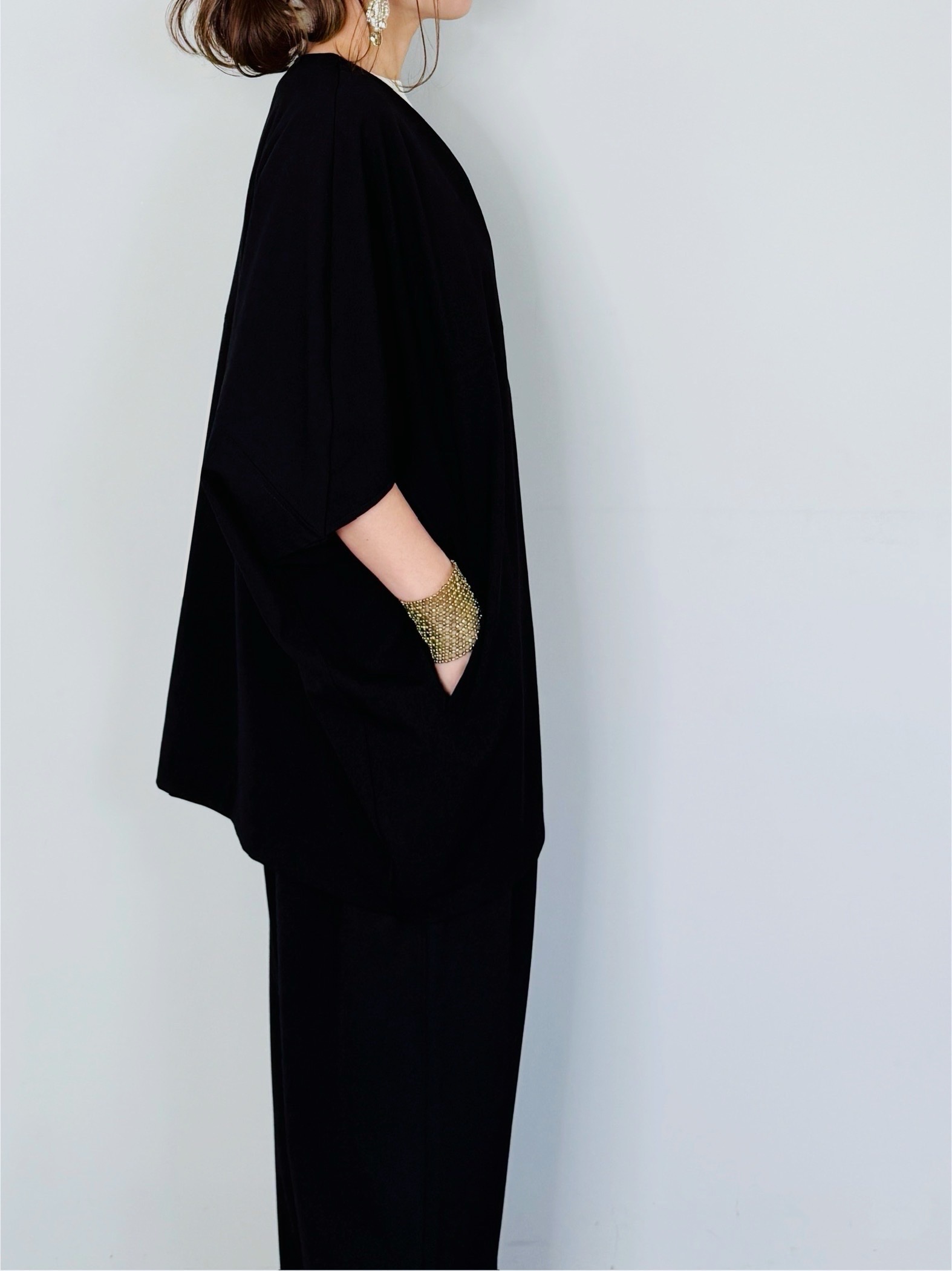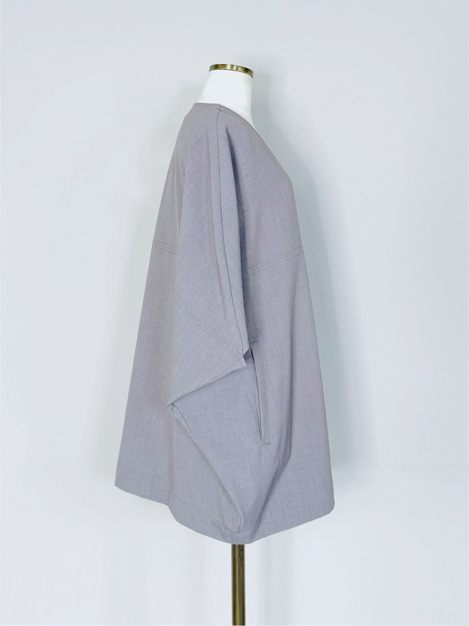 首元はすっきりと見えるVネック仕様で二の腕をカバーする5分袖のドルマンスリーブの形の羽織ベストです。