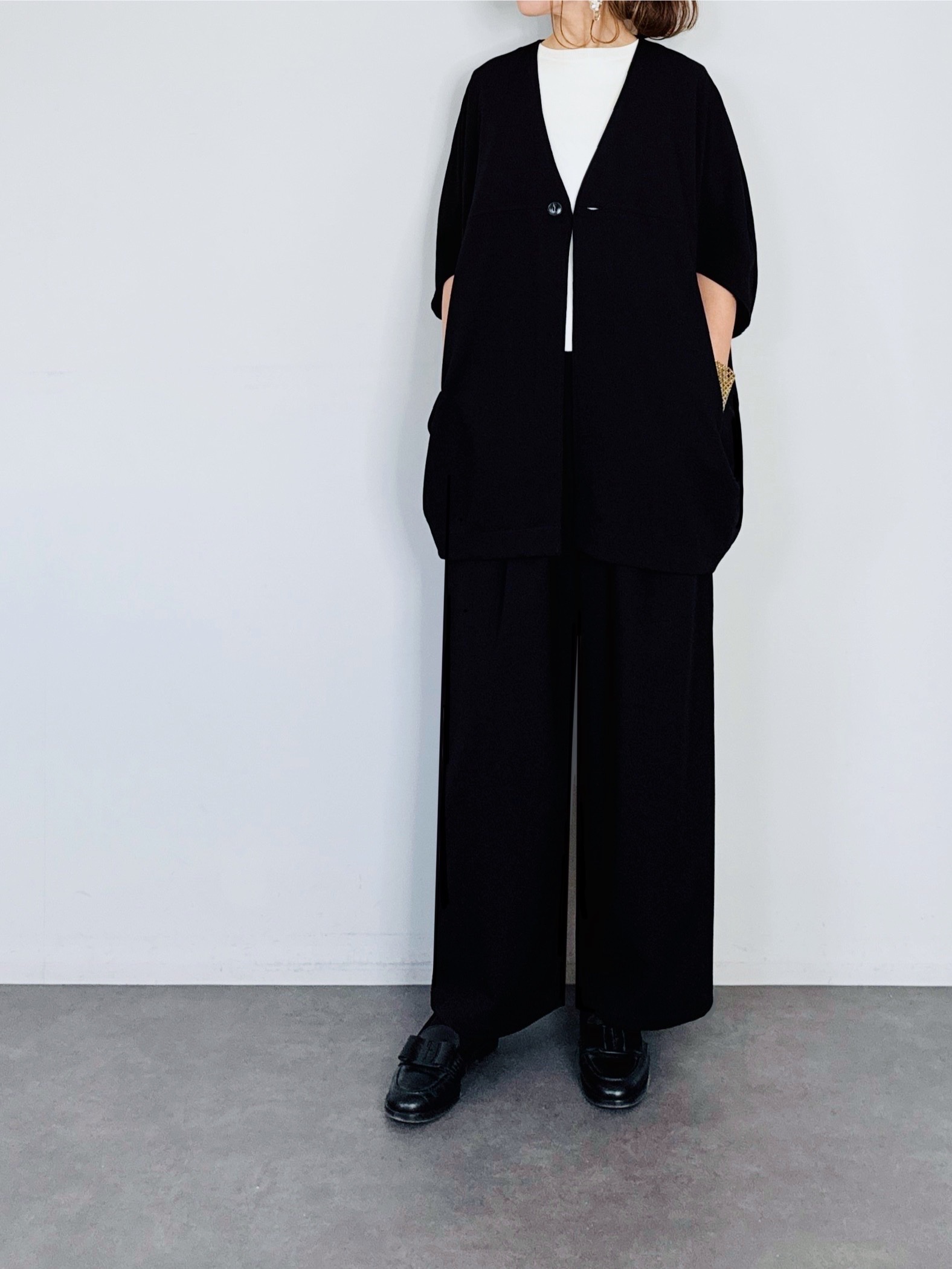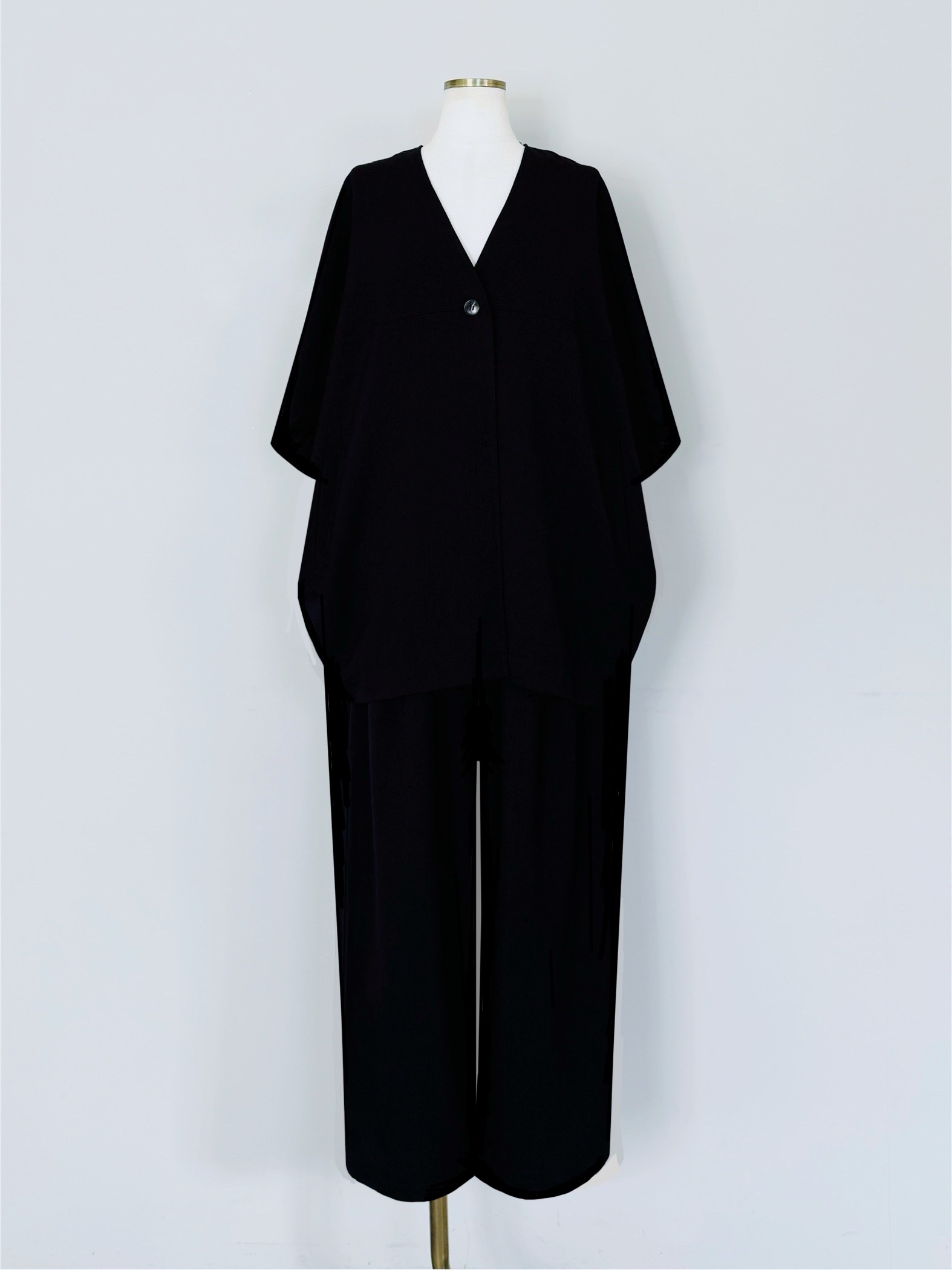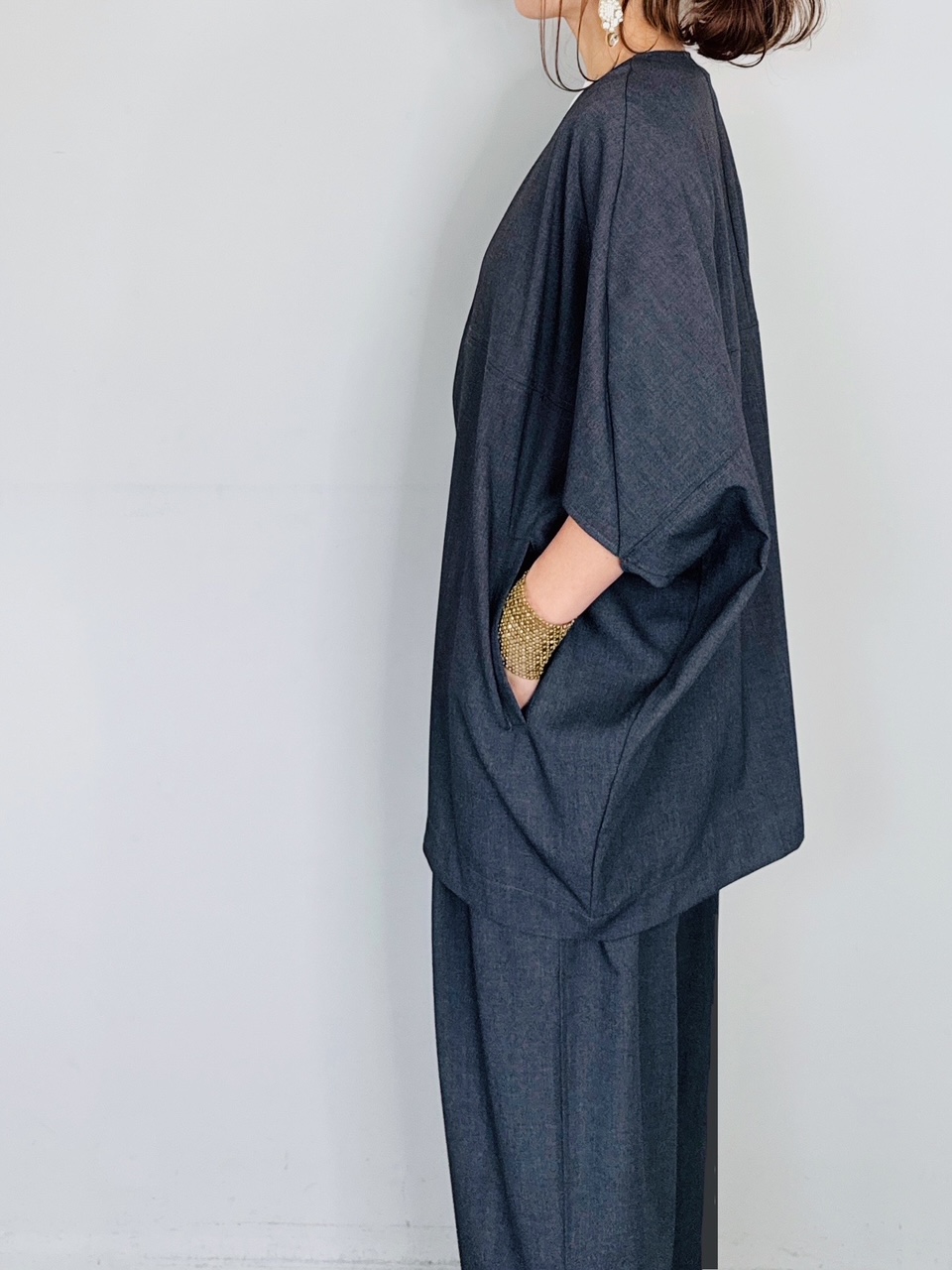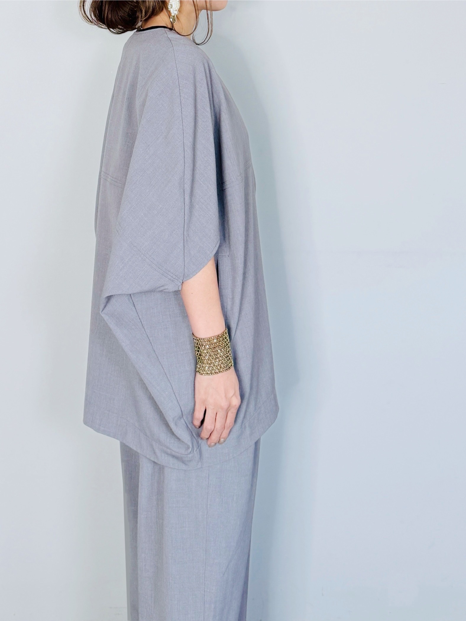 首元はすっきりと見えるVネック仕様で二の腕をカバーする5分袖のドルマンスリーブの形の羽織ベストです。