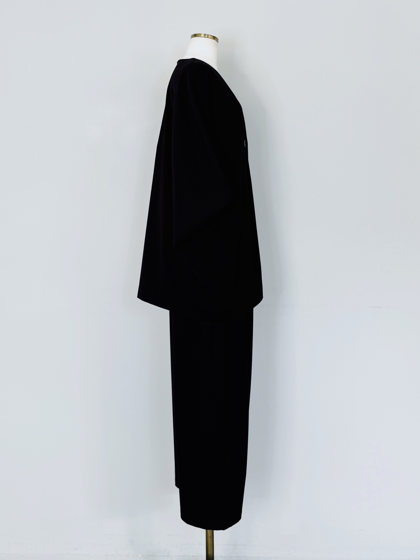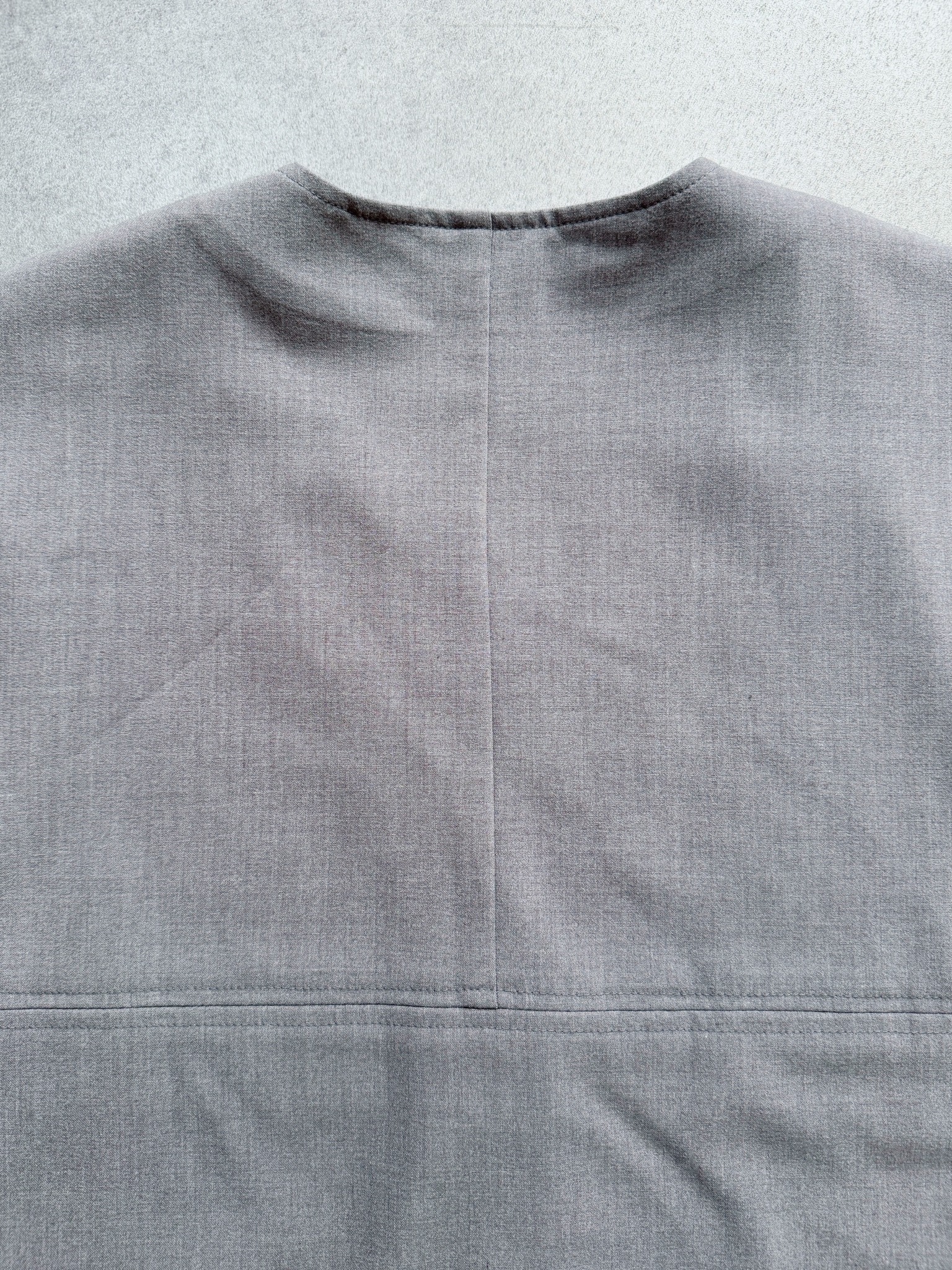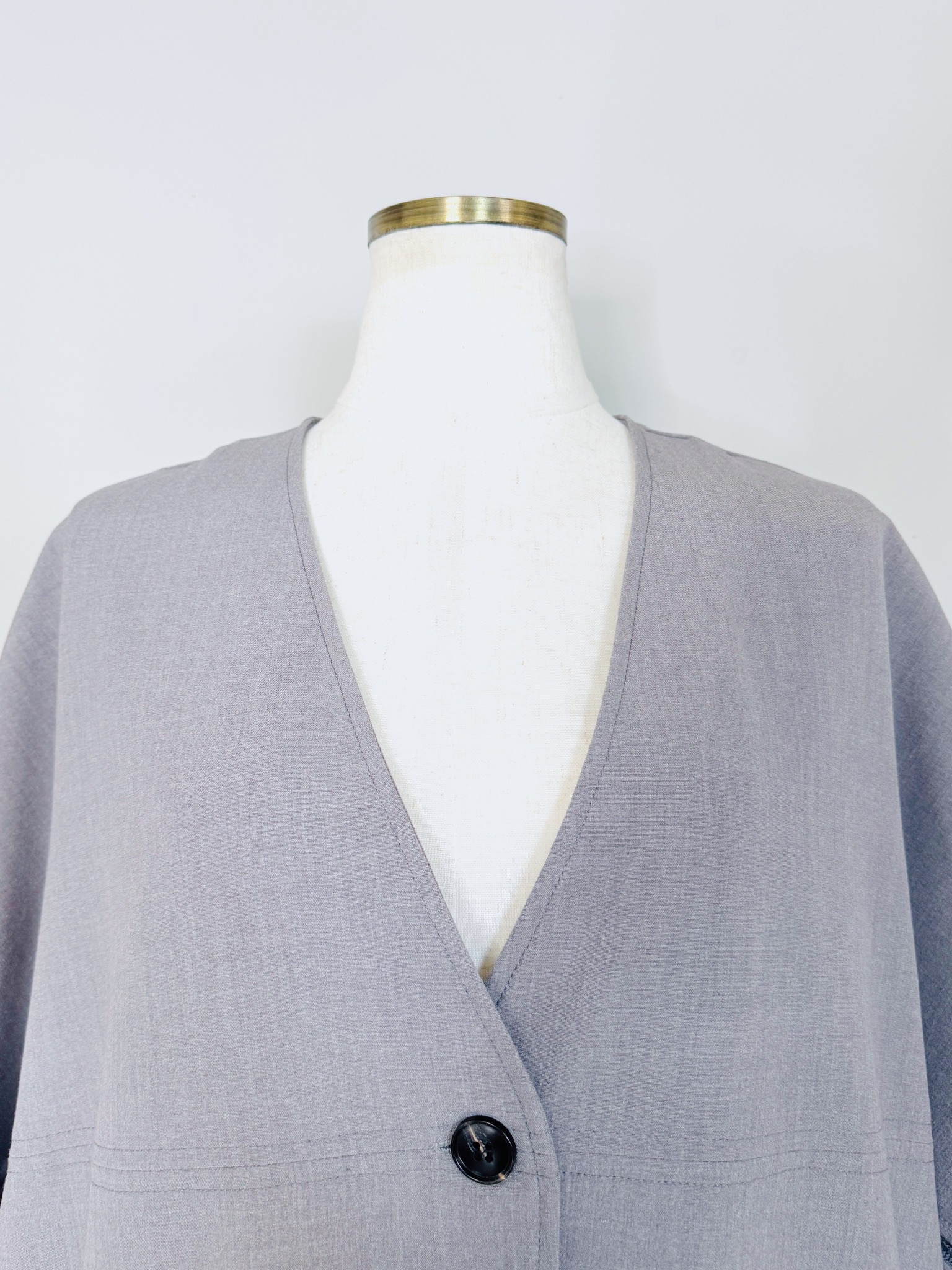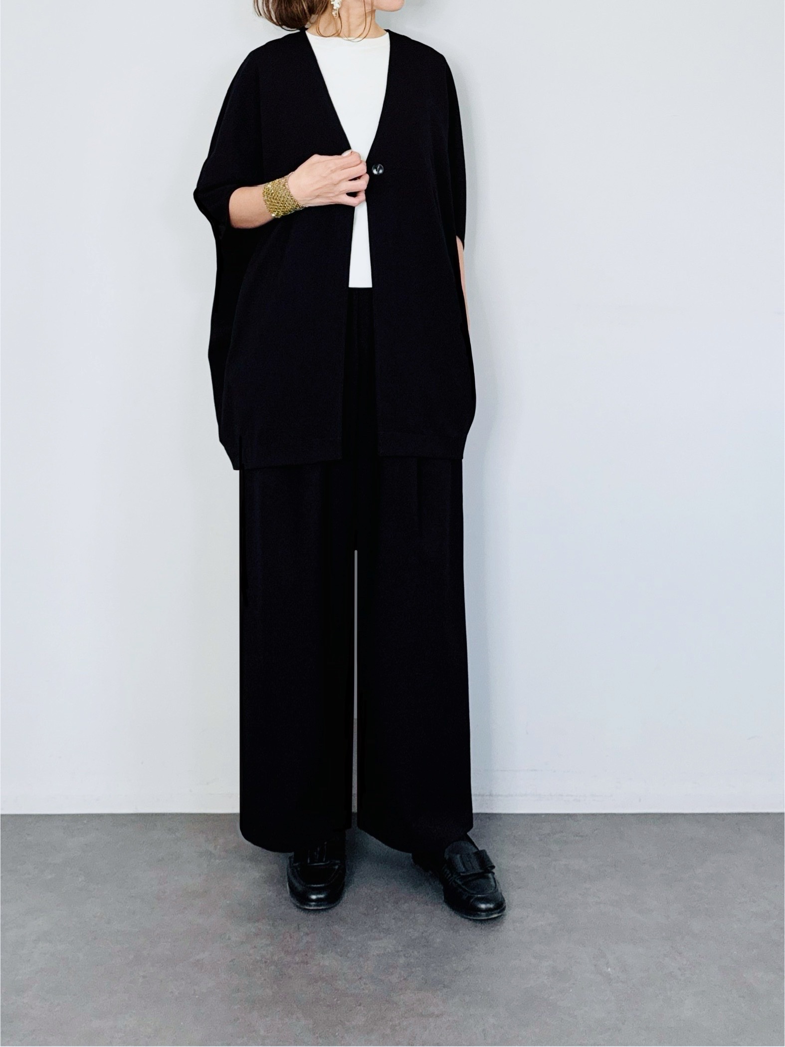 首元はすっきりと見えるVネック仕様で二の腕をカバーする5分袖のドルマンスリーブの形の羽織ベストです。