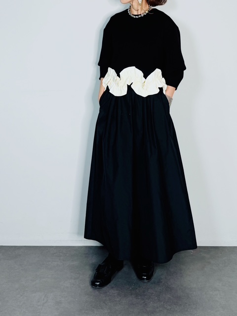 着心地の良いもちもちダンボール素材を使用し、裾に立体的なフリルを施したプルオーバー。